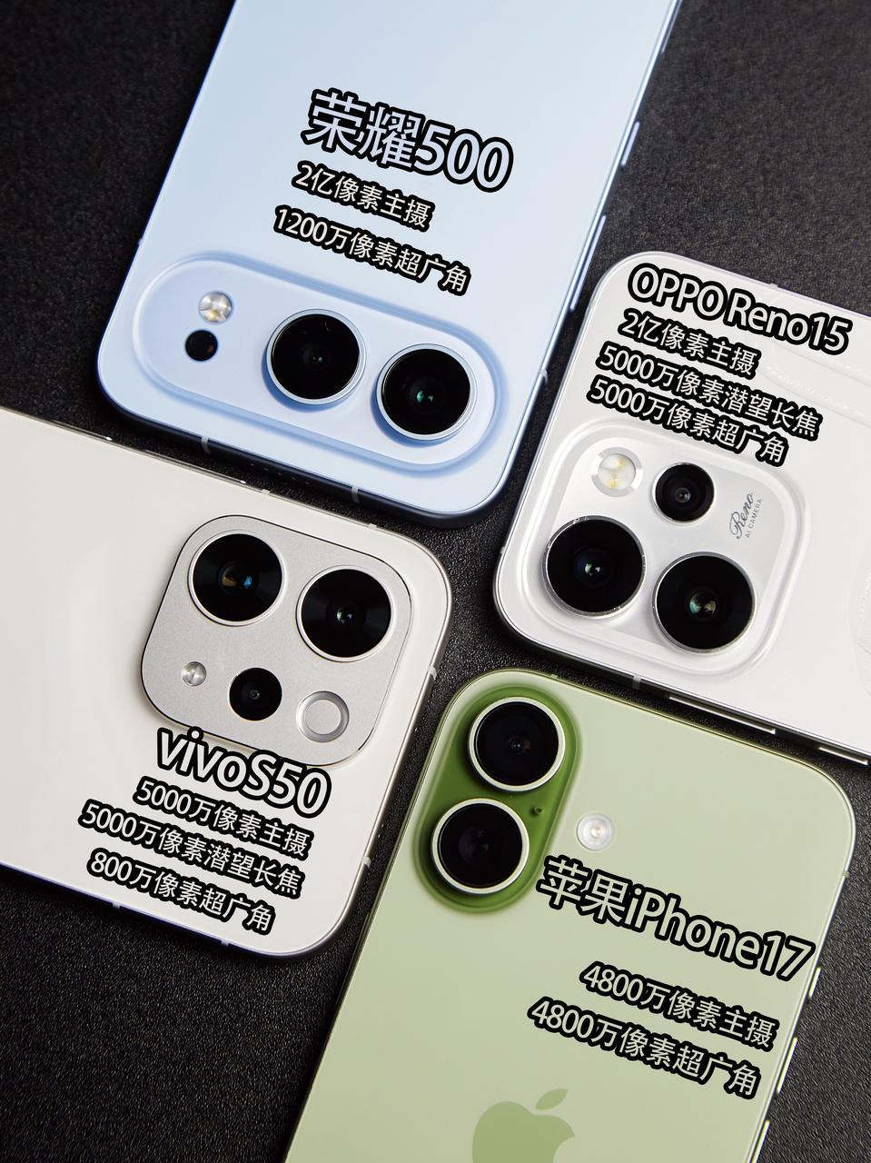 iPhone17平替都在这了!想拍照好选哪款? 虽然身边的人都说今年iPhone17好看又香, 可国补完还得5K多,对于我来说是真远远超过预算😭 做了好久攻略,我打算在荣耀500、OPPO Reno15、vivo S50三款中挑一款, 国补后都是2K+就能到手,感觉还挺香的! - 三款虽然都有点“果里果气”,但质感是真在线~ 特别是荣耀500和OPPO Reno15,都用上了iPhone同款的一体冷雕玻璃! 镜头模组和机身是一体成型的,看着更精致,而且还不会积灰。S50镜头模组和玻璃后盖丝滑拼接,整体辨识度很高。 - 另外,OPPO Reno15和vivo S50都有5000万像素潜望长焦, 跟苹果17、荣耀500的双摄比起来,中长焦和拍远景会更好出片、更容易构图一些。 - 500和Reno15这边甚至还给到了2亿像素主摄,拍人拍景对细节刻画会更到位,照片放大裁切也不用担心会变糊。 - 超广角方面Reno15为5000万像素,S50是800万,500是1200万,🍎17是4800万。 - 综合来看Reno15在相机配置上更良心一点,再加上还有出圈拼图、CCD闪光实况、前后实况同拍、4K超清实况, 实况玩法也足够丰富。 更别说OPPO和苹果跨设备互联也很方便,传照片、同步文档和AirDrop差不多丝滑, 用惯苹果的换过来应该很快能适应! - 所以…预算有限的宝子,真不用硬上苹果,我倒是喜欢Reno15多一些,但又有点纠结500的超大电池和性能,至于S50的超声波指纹解锁也是吸引我的点。 - 反正我觉得这几款国产机型颜值和体验都能跟iPhone17掰掰手腕~ 你们说选谁? 高颜值手机 iPhone17 OPPOReno15 vivoS50 荣耀500 手机摄影 实况照片 国补