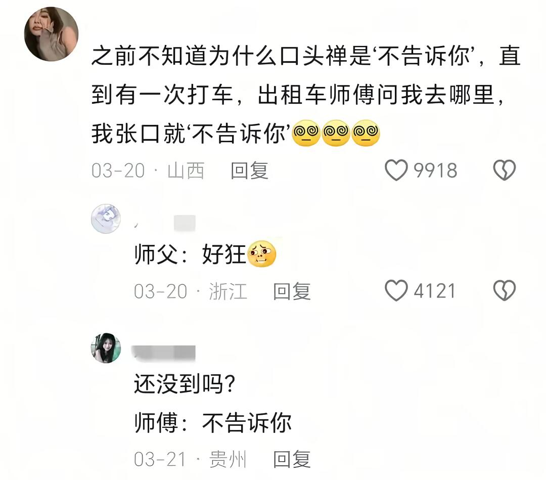 之前不知道为什么口头禅是'不告诉你',直到有一次打车,出租车师傅问我去哪里,我张口就'不告诉你'
