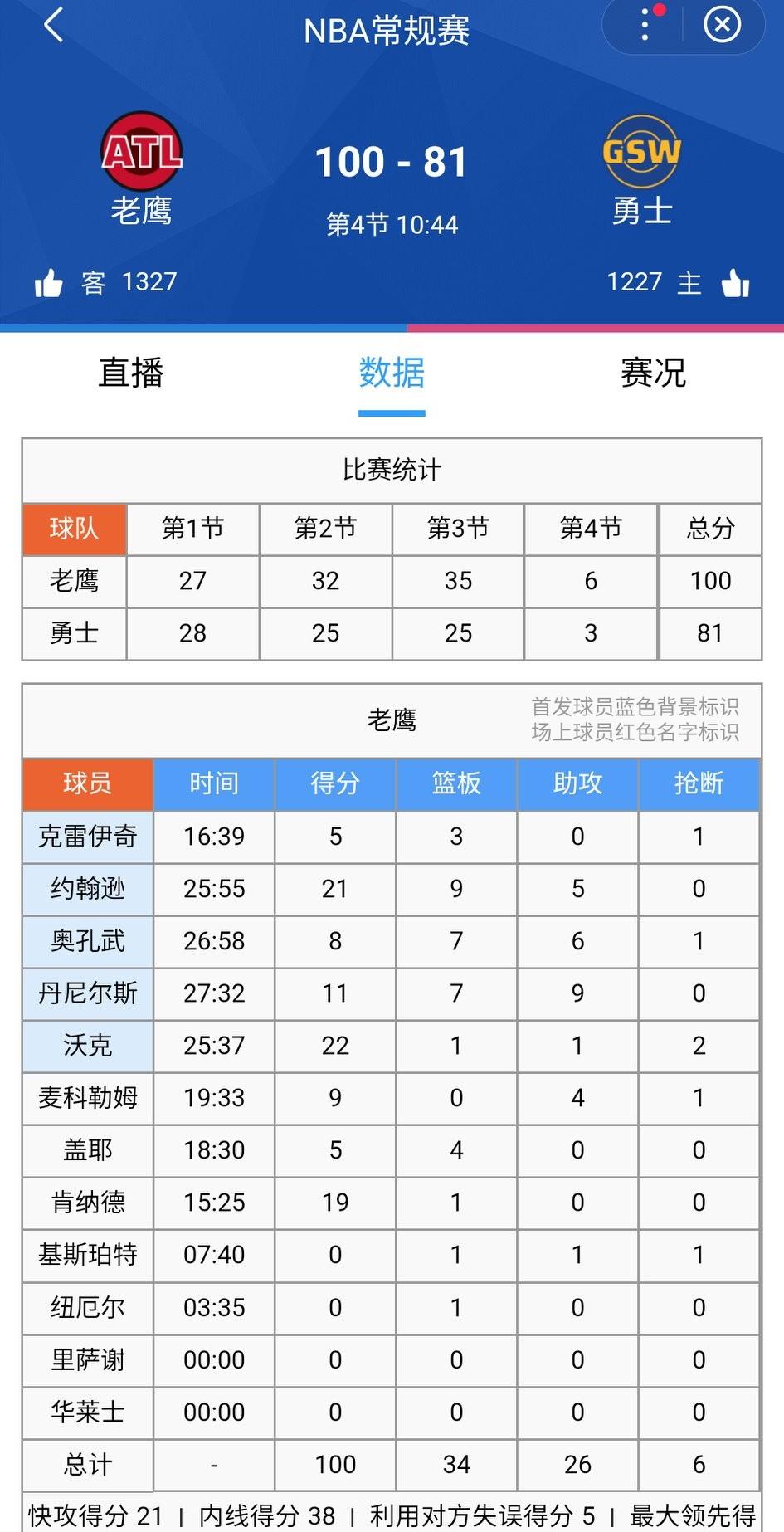 老鹰100-81勇士!发生了什么,勇士怎么就落后19分了!没过两分钟,比分又拉大到23分了…… 肯纳德投疯了,连中3记三分,亚历山大沃克上篮打成2+1,老鹰打出一波15-2。 第四节还剩9分钟,落后23分,勇士队全队正负值只有梅尔顿是正的,其余全员为负,比赛可以放了。