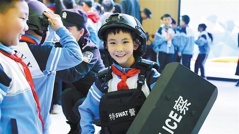 1月6日下午,市公安局组织各警种走进廊坊市第一实验小学,开展“110进校园”主题活动,为同学们送上一堂全方位的安全防护课(图为小学生体验警用装备)。