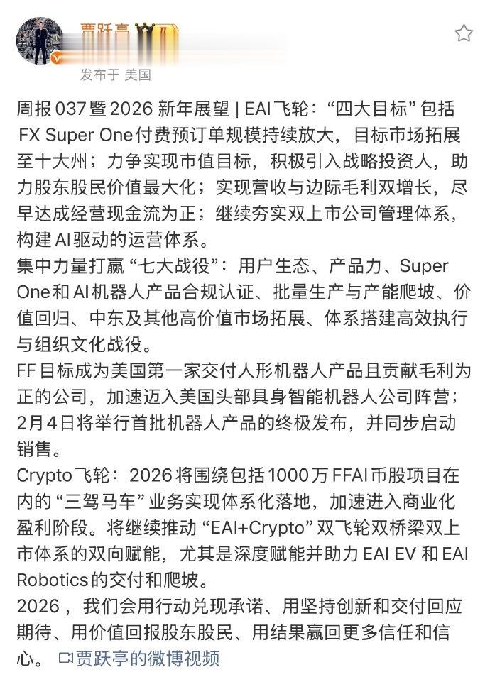 [#贾跃亭称首批机器人2月4日发布#]1月12日,法拉第未来(FF)创始人贾跃亭发文预告称,FF将于2月4日在美国拉斯维加斯举行的NADA北美汽车经销商大会上,举行首批具身智能机器人产品的终极发布,并同步启动销售。