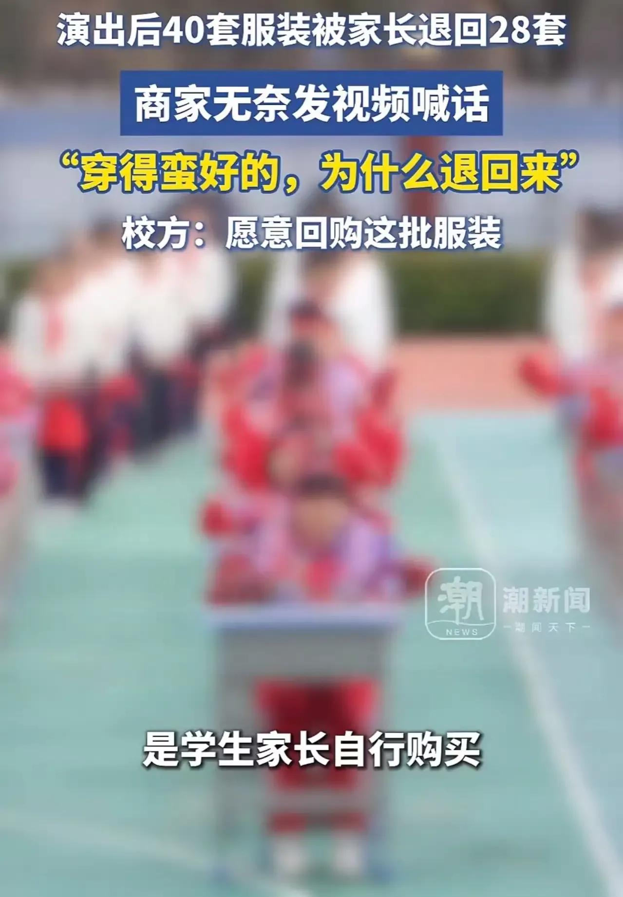 元旦学校演出刚结束,28套演出服装竟被家长集体退回!商家无奈发视频吐槽:“都穿过了还退,这合理吗?”这究竟是家长太计较,还是另有隐情? 事情是这样的,元旦期间某学校举办了一场盛大的演出,孩子们穿着崭新的服装载歌载舞,场面十分热闹。可演出刚结束,就有28套演出服装被家长退回了商家。商家一看,这些衣服都已经被穿过,甚至有的还有污渍和破损,顿时感到十分无奈。商家表示,他们理解家长可能觉得演出服装只穿一次就浪费,但已经穿过的衣服再退回,确实让他们难以接受。对此,学校方面回应称,家长的行为与学校无关,学校并没有要求家长退回服装。同时,学校也表示愿意回购这批服装,以减轻商家的损失。这一事件引发了网友们的热议,有人认为家长过于计较,应该尊重商家的劳动成果;也有人认为学校应该提前沟通好,避免类似情况的发生。 演出服装被退回,看似小事一桩,却折射出家长、学校和商家之间的沟通与理解问题。你怎么看待这件事呢?快来评论区留言,一起聊聊你的看法吧!演出服退货事件 舞蹈课退款 演出鞋退货