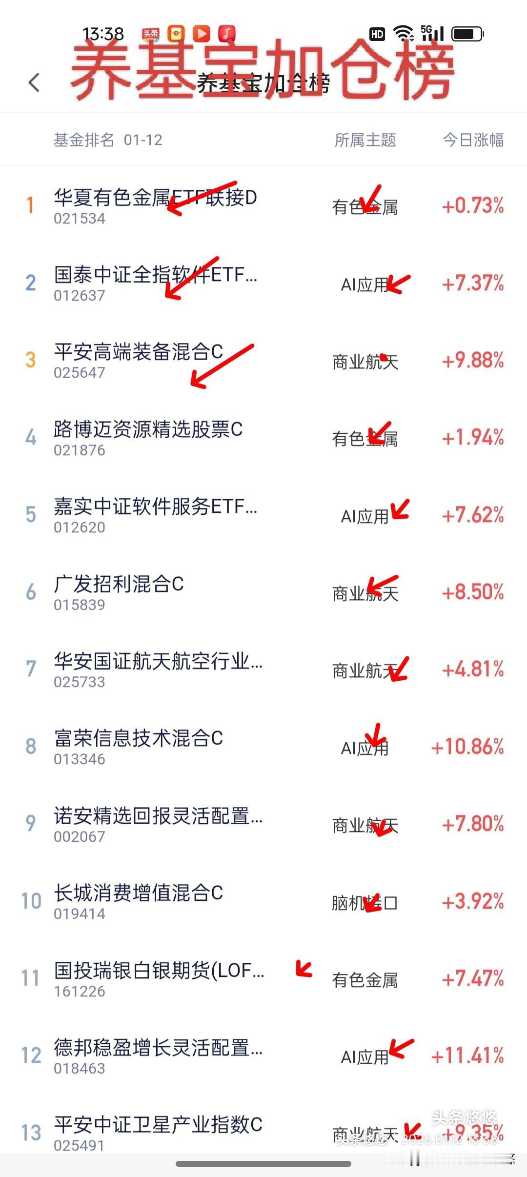 12号基金操作观点(仅供参考) 我要追高! 主力资金也是看透了散户或者踏空者的心理,都盼着回调介入,主力反而不回调,甚至盘中回踩一下继续上行,踏空者盼跌者只能追高上车! .. 目前大盘走势健康,均线多头排列,即使短线回撤一下,也能马上涨回来,本月必涨收阳无疑,跨年行情、春节红包一并发给你! 上周⑤一口气加仓1万多,就是没有追高介入ai应用板块,加仓的半导体材料及先锋弱的不要不要的,不加的传媒或者少加的航天涨的目瞪口呆!看来固有观念及心态难以改变,这也是人性弱点!有不少粉丝根据本人的观点操作,赚钱了! 目前有两种选择,一是守住滞涨板块等待轮动补涨,比如新能源板块,半导体芯片, cpo机器人,医药板块等。二是追高介入强势板块,比如商业航天,传媒游戏 软件板块等。本人研究几天永赢信息产业申万菱信数字产业两个基金,踏空20%没有下手,今天列入观察仓位!大胆的可以追德邦稳增长更强势。 传媒游戏前面刚发了分析去看看作为参考。 光伏产业周末有分析,值得一看。 可控核聚变继续持仓待涨或者定投或者强行加入。 有色金属继续看涨,定投或者加仓,持仓待涨均可,医药板块定投或者加仓均可。 ... 点赞转发关注投资理财不迷路