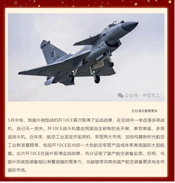 文中提到:5月中旬,我国外销型战机歼10CE首次取得了实战战果,在空战中一举击落多架战机,自己无一损失。歼10CE战斗机是由我国自主研制的全天候、单发单座、多用途战斗机。