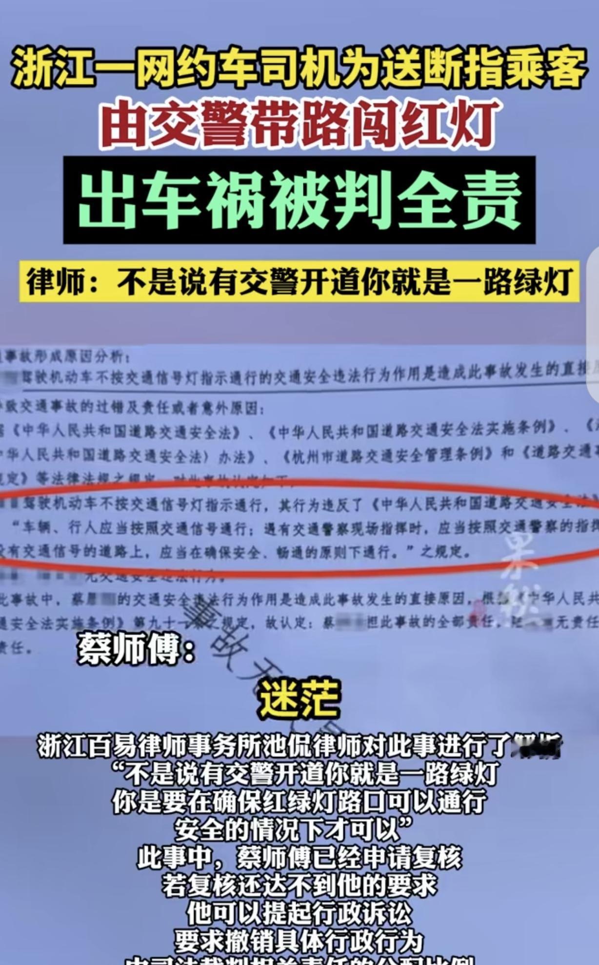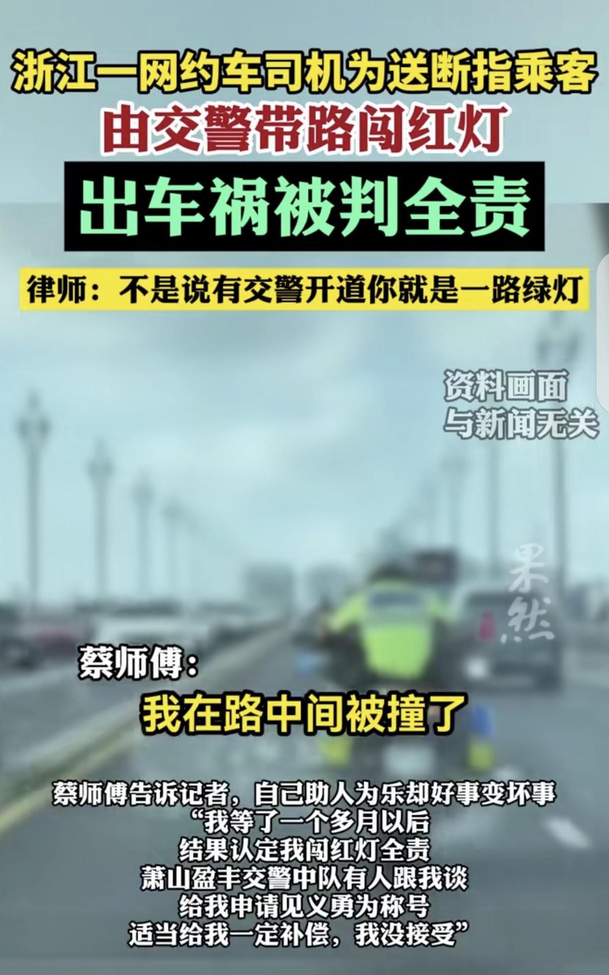 “去哪儿说理?”浙江杭州,一男子开网约车,他为了送断指乘客去医院,由交警带路闯了红灯,可不料路上出了车祸,男子竟被判定全责,他感觉自己比窦娥还冤。男子:你闯红灯,让我跟着你,路上我被撞了,还判我全责,我委屈,凭啥? 据1月10日齐鲁壹点报道,蔡师傅在杭州开网约车,每天早出晚归,风里来雨里去奔波。 蔡师傅虽然肩负养家糊口的担子,但为人古道热肠,心地善良。 3个月前的一天,蔡师傅接到了一个单子,可拉上乘客后,他发现其中一个乘客,疼的脸色苍白,满头大汗。 他这才知道,这个乘客手指被机器切断了,装在塑料袋里,他们要马不停蹄去医院做接指手术,不能耽误。 蔡师傅看乘客的断指处血流如注,知道非同小可,他必须争分夺秒,乘客在家里,跟自己一样是个顶梁柱,如果他手指接不上残疾了,以后干不了重体力,就没办法挣钱养家糊口了。 于是,蔡师傅一脚油门,直奔最近的医院飞奔而去,大约开了一公里,他看到路边有交警执勤,就跟交警求助。 因为这一路,不少的红灯,红灯停绿灯行,虽然遵守了交规,但乘客急着就诊,刻不容缓。 乘客和伤者也都希望交警网开一面,给自己行个方便,希望交警能前面开路,畅通无阻。 交警一看,乘客确实伤的不轻,他二话没说,立马警车开道,让蔡师傅紧随其后。 可万万没想到,只开了几百米,他走到路口红灯处,被一辆私家车给撞了。 蔡师傅这个懊恼,虽然人没受伤,但本来是一件助人为乐的事,最终却变成这个样子,也没帮上受伤乘客,他心里很不是滋味。 可让蔡师傅无法接受的还在后面,他等了一个月,竟被认为为全责,理由就是他闯了红灯。 毕竟蔡师傅属于做好事,但公是功过是功,不能功过相抵,可以给蔡师傅申请见义勇为称号,给予一定补偿,但该承担的责任还是要承担。 蔡师傅斩钉截铁拒绝了,在他看来,自己太冤了,交警说他前面开道,让蔡师傅跟牢,他闯红灯,自己要跟紧,就必须也得闯红灯,这也是迫不得已,路上被撞,怎么能判他全责呢? 蔡师傅不服,提起复核,结果是,该道路交通事故认定事实不清,责令重新调查认定。 可1月8日,蔡师傅还是收到闯红灯全责的处理结果,他一百个不服。 但律师却说,不是说有交警开道,就是一路绿灯,你是要在确保红绿灯路口可以通行,安全的情况下才可以。 目前,蔡师傅申请复核,如果结果让他大失所望,律师联系他走法律程序。 紧急情况下,交警示意跟着警车闯红灯没错,但闯红灯的前提条件是,确保安全的情况下进行,不是让你事无忌惮的闯红灯。 这种情况属于法律的缺失,其实按正常逻辑,人家做好事不能寒了好心人的心,交警让他跟着走,这时候他属于特种车辆了,原则上其他普通车辆需要让行。建议以后铁骑车上带一个磁吸警灯,紧急情况下在社 会车辆放一个,从放上警灯开始,这个车就属于特种车辆,社 会车辆要注意避让。发生事故就好判责了。 这事儿听着真让人憋屈!蔡师傅好心送断指乘客,交警都开道了,结果被撞还背全责,换谁都得喊冤! 法律上确实有讲究:交警开道不等于“免死金牌”,闯红灯必须“确保安全”。 可问题是,蔡师傅是跟着警车走的,普通司机哪能判断路口有没有车?这时候还按“正常闯红灯”判责,明显不合理,人家是执行交警指令,又不是自己瞎闯! 人情味儿不能丢,蔡师傅做的是见义勇为,该鼓励而不是“秋后算账”。就算要担责,也得分情况:比如私家车没让行、交警指挥有疏漏,这些都得查清楚再定责。现在一刀切判全责,寒了好心人的心,以后谁还敢帮人? 交警开道时,能不能给社 会车辆发个明显信号,比如磁吸警灯,明确“这车现在归交警管,都得让”?这样出了事,责任也好划分。 最后说句公道话,蔡师傅没错,交警也没错,但法律得跟上人情。支持他继续复核、打官司,不能让好人流汗又流泪!生活中需要这样的热心肠,法律更该护着他们! 《道路交通安全法》第38条规定:车辆、行人应当按照交通信号通行;遇有交通警察现场指挥时,应当按照交通警察的指挥通行;在没有交通信号的道路上,应当在确保安全、畅通的原则下通行。 交警现场明确指令蔡师傅“跟牢我”,并闪警灯开道,此情形下服从指挥属于法定义务。 但法条同时隐含“确保安全”原则,此为认定蔡师傅全责的关键依据。 交警指挥时未采取临时交通管制,如拦截横向车辆,或未评估路口安全,存在处置疏漏。 蔡师傅作为驾驶员,即使执行指令,仍需主动观察路况,如涉事私家车为绿灯直行,拥有路权。 社 会车辆因紧急救助临时获得通行特权时,缺乏法律身份转换机制。 事故直接原因是蔡师傅闯红灯时未避让绿灯通行车辆,违反安全通行原则,故担责。 法律没区分“主动违章”与“执行指令的被动违章”,更未明确指挥者连带责任。 法条本身未错,但执行僵化!交警一句“跟牢”让司机陷入两难:不跟则违令,跟则需“瞬移预判安全”。支持蔡师傅诉讼。 关注@灋律盐究员 学法辩是非,用法止纷争。