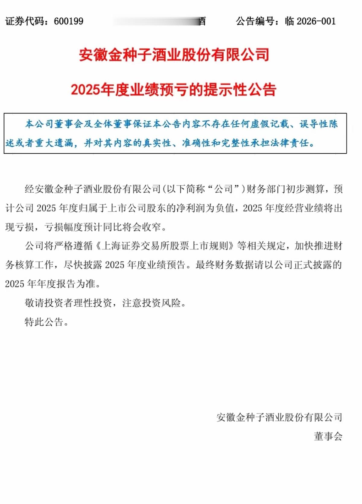 1月11晚间,安徽金种子酒业股份有限公司(金种子酒)2025年度业绩预亏的提示性公告:经公司财务部门初步测算,预计公司2025年度归属于上市公司股东的净利润为负值,2025年度经营业绩将出现亏损,亏损幅度预计同比将会收窄。