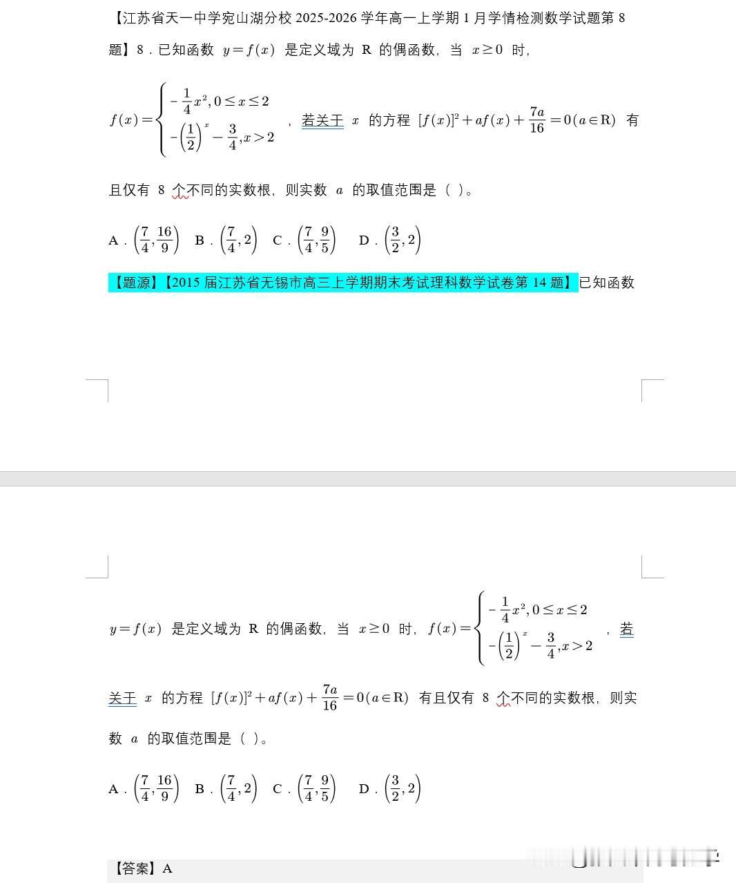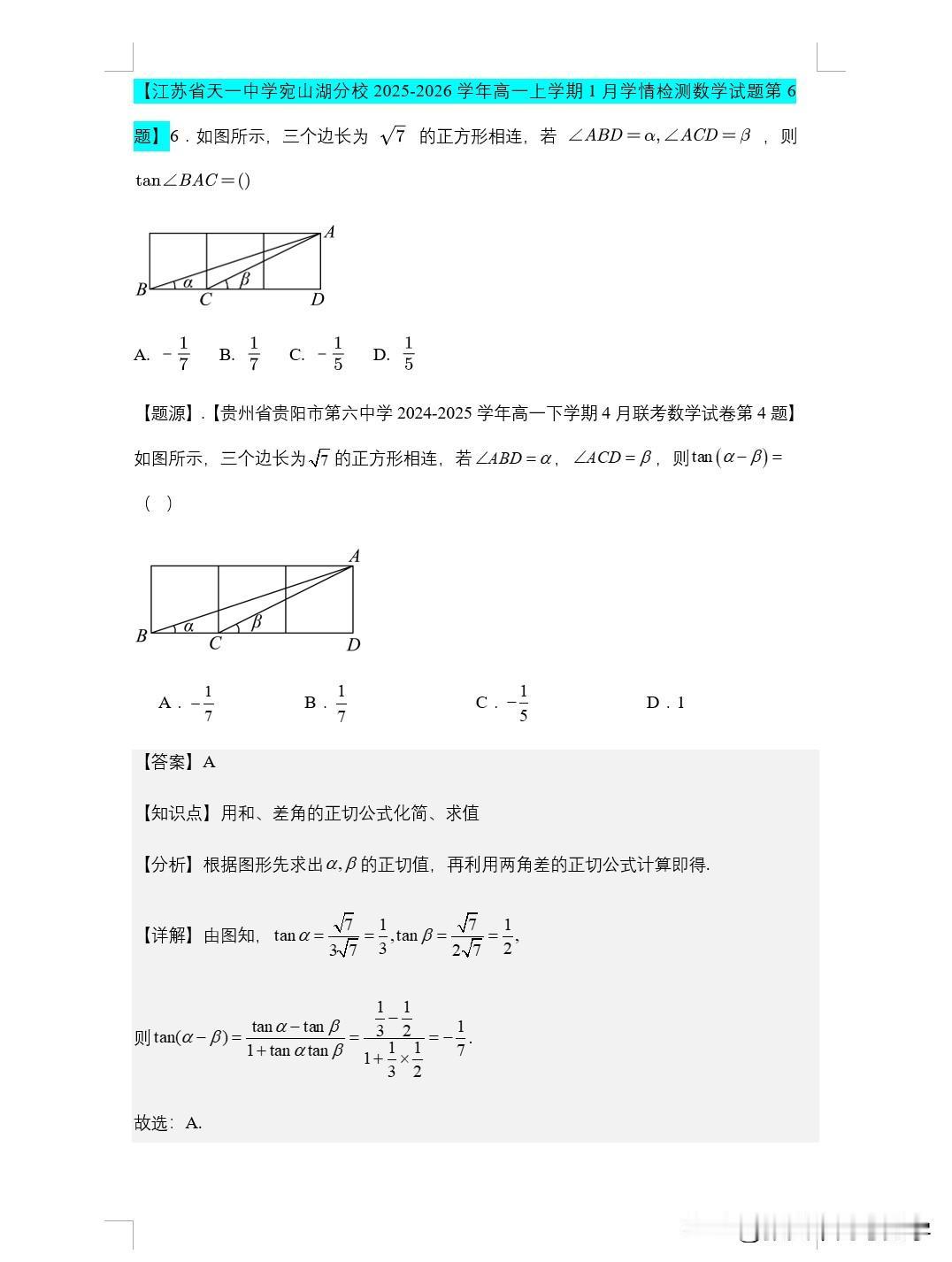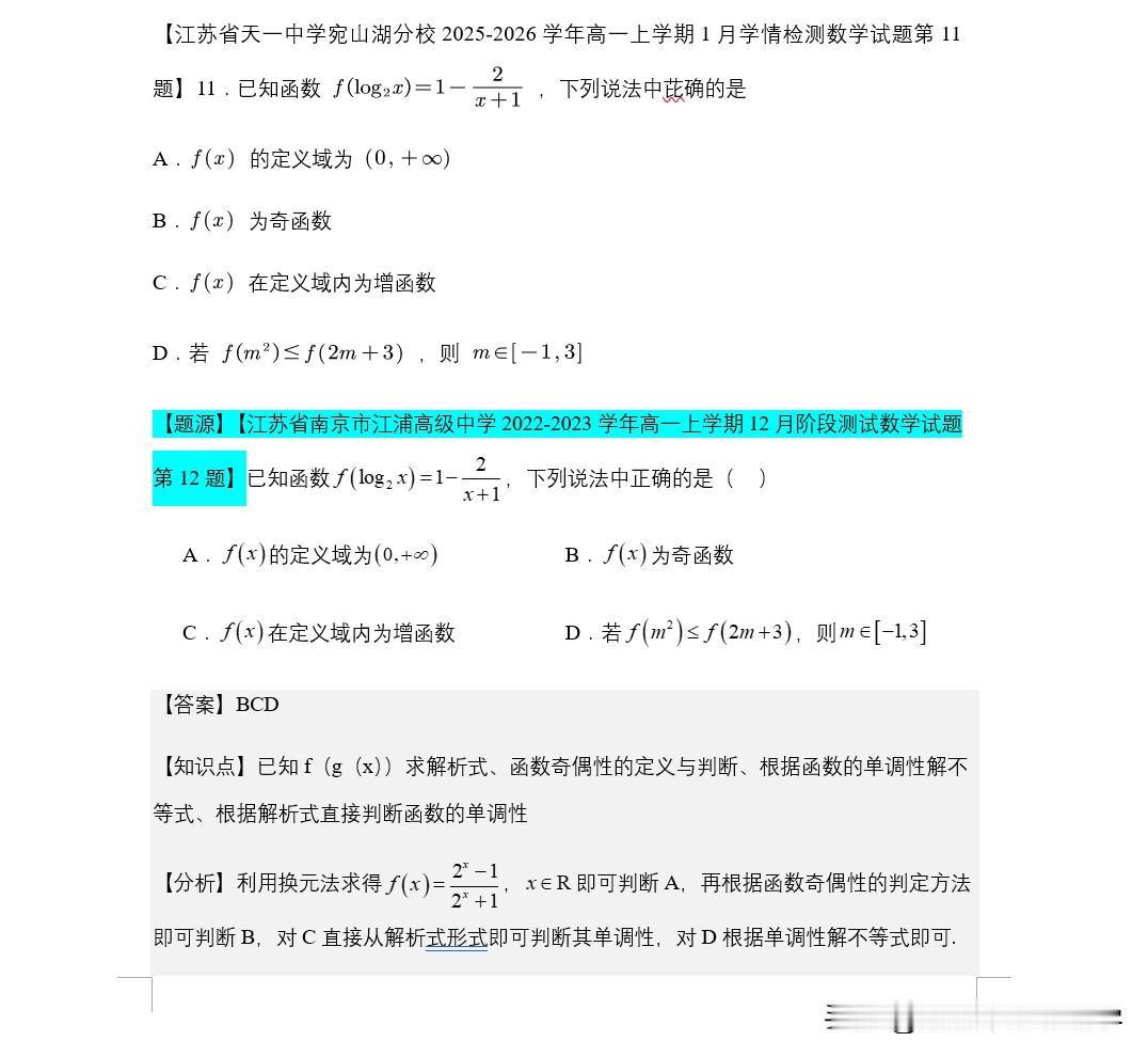 天一中学宛山湖分校高一1月份月考,19题来自靖江12月月考第17题,第18题来自于辅仁期中考试的第17题 第11题来自南京江浦中学第12题题比较老了 第8题来自于2015届无锡高三期末考第14题 第6题,江苏东台第4题,更像的是贵阳的题目。 其实有的时候我在想,月考的目的是什么? 增加考试的次数还是检测学生掌握情况?还是锻炼学生的考试能力?抑或是看大家搜题后的自主学习力考个高分增强一次自信?