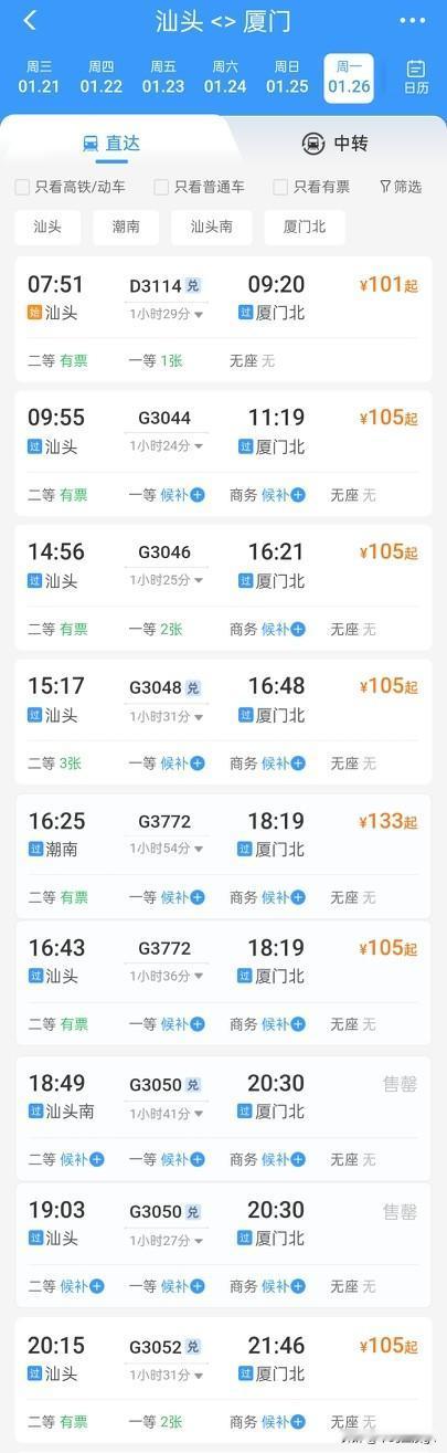 1月26日起,汕头到厦门最快1小时24分并且有多趟车次 最早开行的汕头到厦门的车, 全程需要1小时53分在潮汕站换向 并且只有早上7:27,这一班车 要是其他时间汕头到厦门,还需要倒车 而2026年1月26日起铁路调图以后, 汕头站出发至厦门北站的高铁列车有8个 最快运行时间更是缩短到了1小时24分, 快了半个小时 而且不用再从潮汕站换向,而是直接开往厦门方向 时刻上最早一班车改到7:51发车 并且在9:55 14:56 15:17 16:43 19:03 2 10:15都有一趟车, 做到了全天候,各时段都有汕头到厦门的方向的车次 至此汕头到厦门的高铁出行选择也是更加多了起来 能够按需选择自己想乘坐的车次了 汕头到厦门全长,仅约200多公里 预计到2028年漳汕高铁开通后, 汕头到厦门的高铁将缩短到一小时以内 两城之间实现高效互达