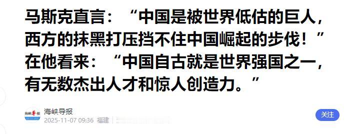万万没想到!世界首富马斯克又抛出一个惊人言论:“中国真的被低估了!中国并没有崛起,中国只是恢复了历史地位,自古就是第一强国,他们有很多聪明的头脑,会做出许多伟大的事情,DeepSeek就是其中之一……” 几千年前的中国,早就站在了世界文明的顶端。中科院曾经梳理过中国古代的重要科技发明创造,足足有88项之多,远不止我们熟知的四大发明。 早在一万年前,我们的祖先就开始栽培水稻,这是世界农业文明的重要起点;战国到西汉时期成熟的二十四节气,至今还在指导农业生产; 还有战国时期修建的都江堰,两千多年来一直滋养着成都平原,现在依然能发挥灌溉作用。 更别说隋唐贯通的大运河,成为了古代南北交通的大动脉,推动了全国的经济文化交流;宋代的水运仪象台,集观测天象、计时、报时于一体,是当时世界上最精密的天文仪器。 那时候的欧洲还处在分散的城邦混战中,我们已经有了如此完善的文明体系,这种深入骨髓的务实和创新,就是老祖宗留给我们最宝贵的基因。 这份刻在骨子里的基因,到了今天依然在发光发热。而这一切的背后,离不开国家对创新的持续投入和无数科研工作者的坚守。 2024年,全国研发投入已经超过3.6万亿元,研发人员总量连续多年稳居世界第一。正是有了这样的底气,我们的科技领域才能遍地开花,不是单点突破,而是全面领跑。 在马斯克最熟悉的新能源领域,我们更是早就站稳了领跑者的位置。 根据最新数据,2025年全年中国新能源汽车出口达到242.2万辆,同比增长86.2%,这种爆发式增长让曾经的汽车强国都望尘莫及。 能源布局上我们也遥遥领先,全球97%的太阳能硅片都是我们生产的。 特高压输变电技术更是独步全球,能把西部沙漠的太阳能电力稳稳送到东部的城市和数据中心,2025年一年新增的绿电就相当于整个法国一年的用电量。 5G基站建设更是突飞猛进,截至2025年11月末,全国5G基站总数已经达到483万个,占移动基站总数的37.4%,这些网络基础设施为数字经济发展打下了坚实基础。 “天宫”空间站在太空常态化运营,航天员长期在上面开展科学实验;“嫦娥六号”成功从月背采样返回,把月球背面的土壤带回了地球;“海斗一号”深入万米深海,揭开了深海的神秘面纱。 更值得骄傲的是量子通信领域,中科大的科研团队刚实现了全异构量子网络架构,能让不同类型的量子系统互联互通,还能支持多种量子任务并行,为构建全球量子互联网打下了关键基础。 科技的进步最终都要落到民生上,这些年我们身边的变化也越来越明显。 全数字PET-CT这样的高端医疗装备实现了中国制造,国产创新药的数量是“十三五”时期的2.8倍; 农作物自主选育品种面积超过95%,中国人的饭碗牢牢端在自己手里;高铁里程世界第一,CR450动车组技术领跑全球,从北京到广州一天就能打个来回。 这些变化不是天上掉下来的,是千千万万中国人靠着聪明才智和勤劳坚韧拼出来的。 想想几十年前,我们还在羡慕国外的先进技术和产品,现在轮到国外羡慕我们了。这种转变背后,正是文明基因的延续和代代相传的奋斗。 马斯克的判断,其实说出了全球有识之士的共同看法:中国从来不是“突然崛起”,只是在经历低谷后,重新回到了本该属于自己的位置。