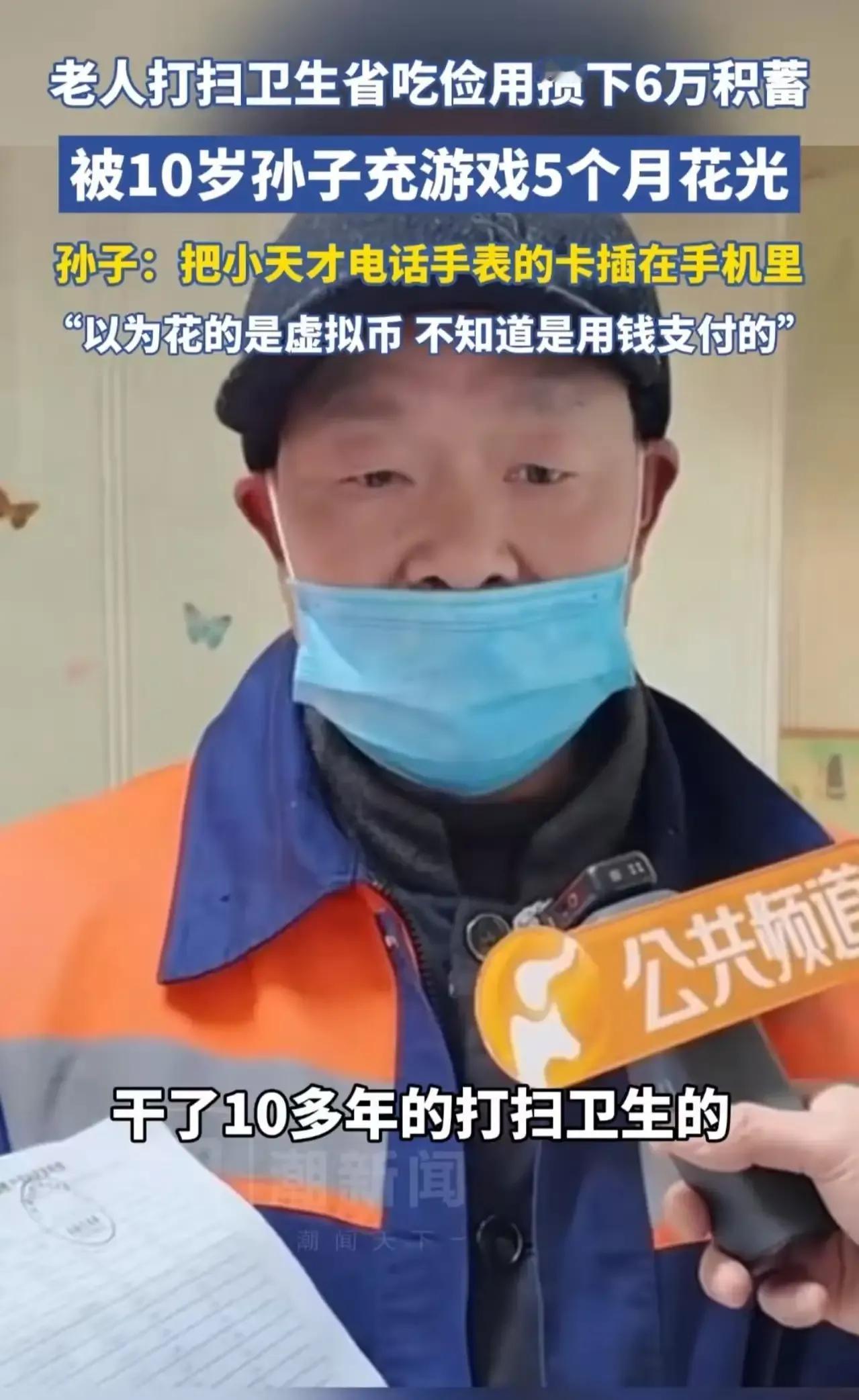 游戏充值又惹祸了!福建一位清洁工老人辛苦攒下的6万积蓄,竟然被10岁的孙子在5个月内充游戏花了个精光,这究竟是怎么回事呢? 据悉,这位老人平时靠打扫卫生为生,省吃俭用才攒下了这6万块钱,原本打算作为自己的养老钱。然而,老人万万没想到,自己辛苦攒下的钱,竟然被10岁的孙子在短短5个月内,全部充值到了游戏里。当老人发现时,钱已经无法追回,老人痛心疾首地说:“我们没有养老金,这些钱想着给自己当养老用的,现在都没了!”而孙子则一脸无辜地表示:“我以为花的是虚拟币,不知道是钱支付的!”这起事件引发了广泛关注,不少网友纷纷表示,游戏充值对于未成年人来说,确实存在很大的风险。家长应该加强对孩子的教育和监管,避免类似事件再次发生。同时,游戏公司也应该承担起相应的社会责任,加强对未成年人充值行为的限制和提醒。 这起事件再次提醒我们,游戏充值需谨慎,尤其是对于未成年人来说,更需要家长的引导和监管。大家对于这起事件有什么看法呢?欢迎在评论区留言讨论,一起为孩子的健康成长出谋划策!游戏充值陷阱 游戏诱导诈骗 手游充值