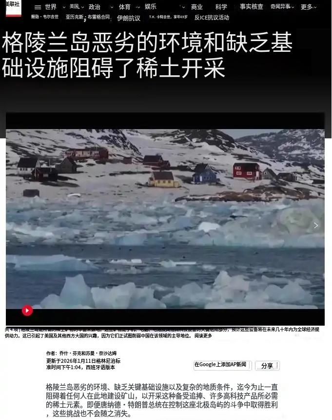 网上热议格陵兰岛拥有 3850 万吨稀土氧化物储量,占世界总储量 1/4 ,格陵兰稀土储量真有这么多?不少人一看这数字,都觉得这地方要靠稀土发大财了。但说实话,大家可别被这组数字给忽悠了,这3850万吨只是初步勘探的估算总量,根本没经过详细的核实和论证。 而美国地质调查局给出的、更靠谱的可开采储量,也就150万吨左右,两者足足差了二十多倍。 打个通俗的比方,这就像有人告诉你家院子地下埋着一堆宝藏,可要么被厚厚的水泥层死死封着,要么连具体埋在哪都不知道,想把宝藏拿到手,第一步就直接卡壳了。 就算真能克服困难把矿石挖出来,后续的提炼加工才是真正的拦路虎,难度比挖矿大得多。为啥这么说?因为格陵兰岛的稀土矿石跟全世界其他地方的都不一样,简直是稀土界的“异类”。 咱们国内包头的稀土矿,还有国外澳大利亚、美国的稀土矿,主要都是氟碳铈矿、独居石这些常见类型,人类研究这些矿石几十年了,怎么开采、怎么提炼,都有成熟的流程和办法,就像家里做家常菜,菜谱早就烂熟于心,照着做就行,成本也能稳稳控制住。 但格陵兰的稀土,主要藏在斯坦硅石和异性石这两种少见的石头里,这两种矿石在全球都没多少存量,根本没有现成的提炼经验和范本可以参考,完全得从零开始摸索。 可能有人觉得,不就是换种石头吗?稍微改改提炼工艺不就完了?要是这么想就太简单了。 有个真实案例,加拿大有家叫阿玛洛克的公司,早在2017年就盯上了格陵兰的稀土资源,跑到当地搞矿产开发,折腾了六年,直到2023年才拿到稀土勘探许可证,原本计划去年春天就开始正式钻探和试验提炼,结果至今都没取得什么实质性进展。 核心问题就是卡在了提炼技术上,他们的技术团队研究了好几年,做了上百次试验,连最基本的工艺参数都没摸透。 更麻烦的是,这两种石头的成分特别复杂,里面还混着铀、钍这些有放射性的物质,想把稀土分出来,第一步就得先处理这些危险的放射性物质。 这不仅大大增加了提炼难度,还得额外投入巨额资金建专门的环保设施,不然根本过不了环保关。 再说说成本,更是高得吓人,普通人根本想象不到。想拿到同样多的稀土,格陵兰得开采两三倍的矿石,光清理开采出来的废石,成本就比我们国内高很多。 再加上格陵兰岛80%的面积都被冰盖覆盖,一年就只有三四个月的时间能开工采矿,矿区位置偏远,连条像样的公路都没有,不管是运采矿设备,还是招工人、运物资,都得靠空运,空运的成本可比陆运高太多了。 更别说建工厂还得先建发电厂,在格陵兰那种极寒地区建一座发电厂,就得花数亿美元,这些前期投入加起来,简直是天文数字。 有人可能会说,不是有美国、欧盟的企业帮着格陵兰吗?这总该能成吧?可实际上,这些所谓的帮忙项目,至今一个都没投产。 更要命的是,格陵兰当地特别缺熟练的技术工人,就算将来工厂建好了,也找不到会操作提炼设备的工人。 再加上当地环保政策管得特别严,因为稀土矿里有放射性元素,很多项目一推进就会引发环保争议,甚至陷入法律僵局,想顺利推进比登天还难。 所以说,格陵兰有稀土是真的,但要说靠这3850万吨的储量就能变成稀土大国、发大财,纯属想多了。 那些鼓吹格陵兰稀土能改变全球稀土格局的说法,根本没考虑实际的开采和冶炼难度。对格陵兰来说,这些稀土就像埋在地下的“烫手山芋”,看得见、摸得着,却根本吃不下、咽不下。 短期内,想把这些特殊的稀土矿石变成能实际利用的稀土产品,不仅要突破重重技术难关,还得砸进去几百亿美元,花上十几年的时间,最后能不能赚钱还不一定。总之,大家别被表面的储量数字忽悠了,格陵兰的稀土想变现,真的比登天还难。