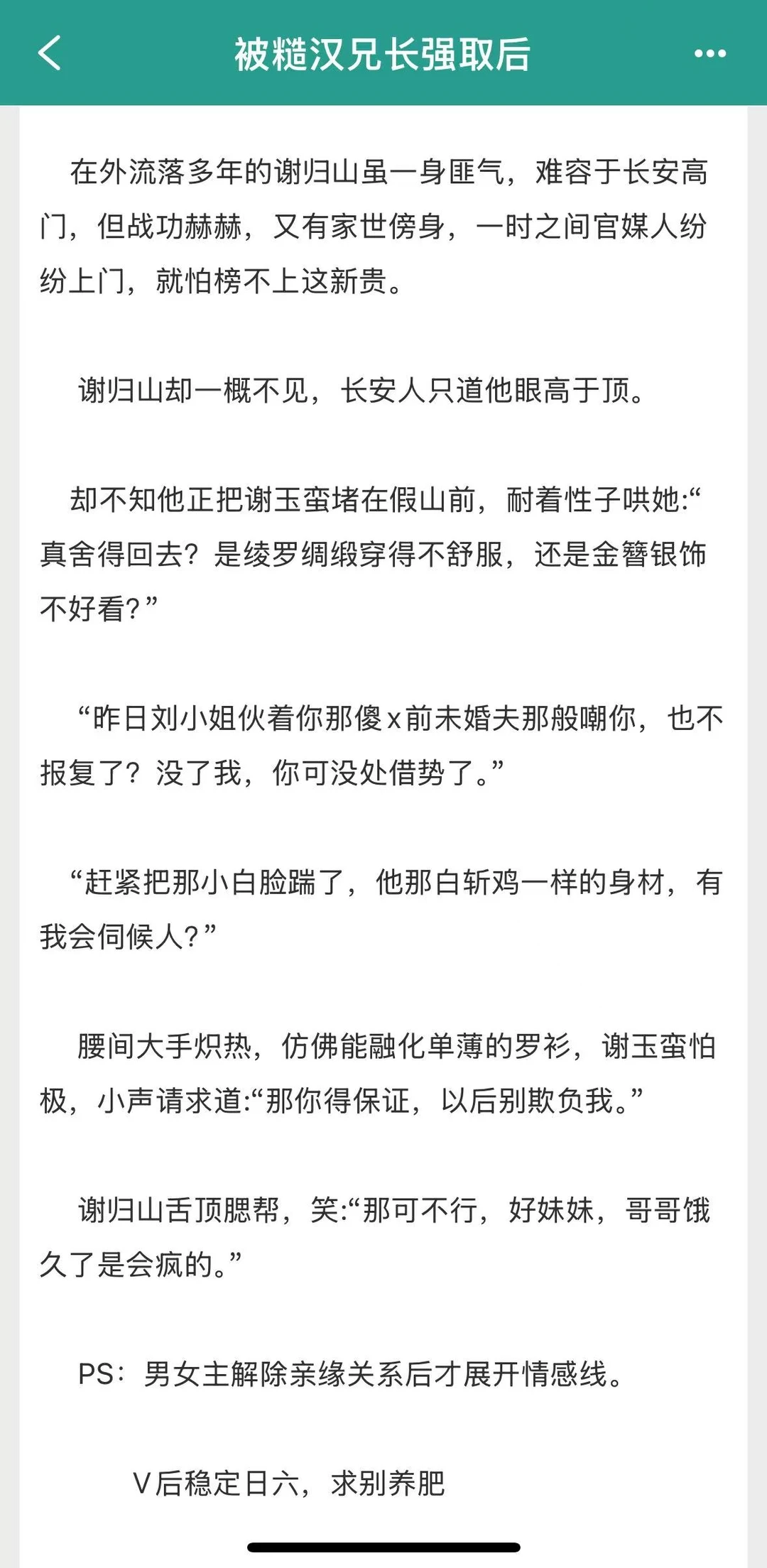 [老虎R]《被糙汉兄长强取后》,作者:相吾 [老虎R]傲娇假千金 x 霸道糙汉兄长 [老虎R]古言/宫廷侯爵/伪兄妹/强取豪夺/相爱相杀 [种草R]作者大大写得很有张力,不仅是整个故事的氛围都很有烟火气,细腻真实;在人物塑造上,主角情感变化中,故事情节推进上,都非常精准且流畅。 [种草R]女主的成长曲线也很有张力,从一开始的娇纵贵女,到后来得知自己的身份真相之后的崩溃,再到一步步认清现实,从被动接受命运,到主动抗争,人物弧光非常动人。