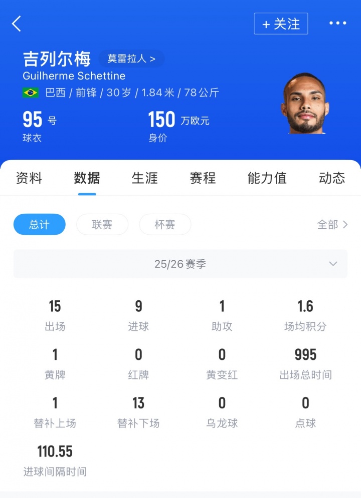 现年30岁的吉列尔梅代表球队出场15次,攻入9球。目前德转身价为150万欧元