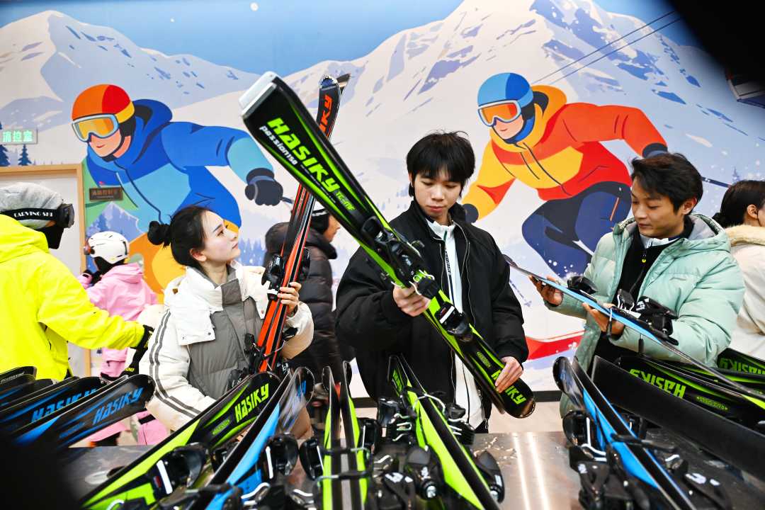 1月11日,昭君国际滑雪场内,游客在挑选滑雪器材。