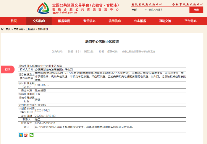 大皖新闻讯1月12日,记者从合肥公共资源交易中心获悉,合肥市2026年首批多个老旧小区改造工程已启动招标。改造覆盖新站高新区、蜀山区、合肥经开区、长丰县、庐江县等多个区域,涉及30余个老旧小区,将系统性提升居民居住环境与生活品质。