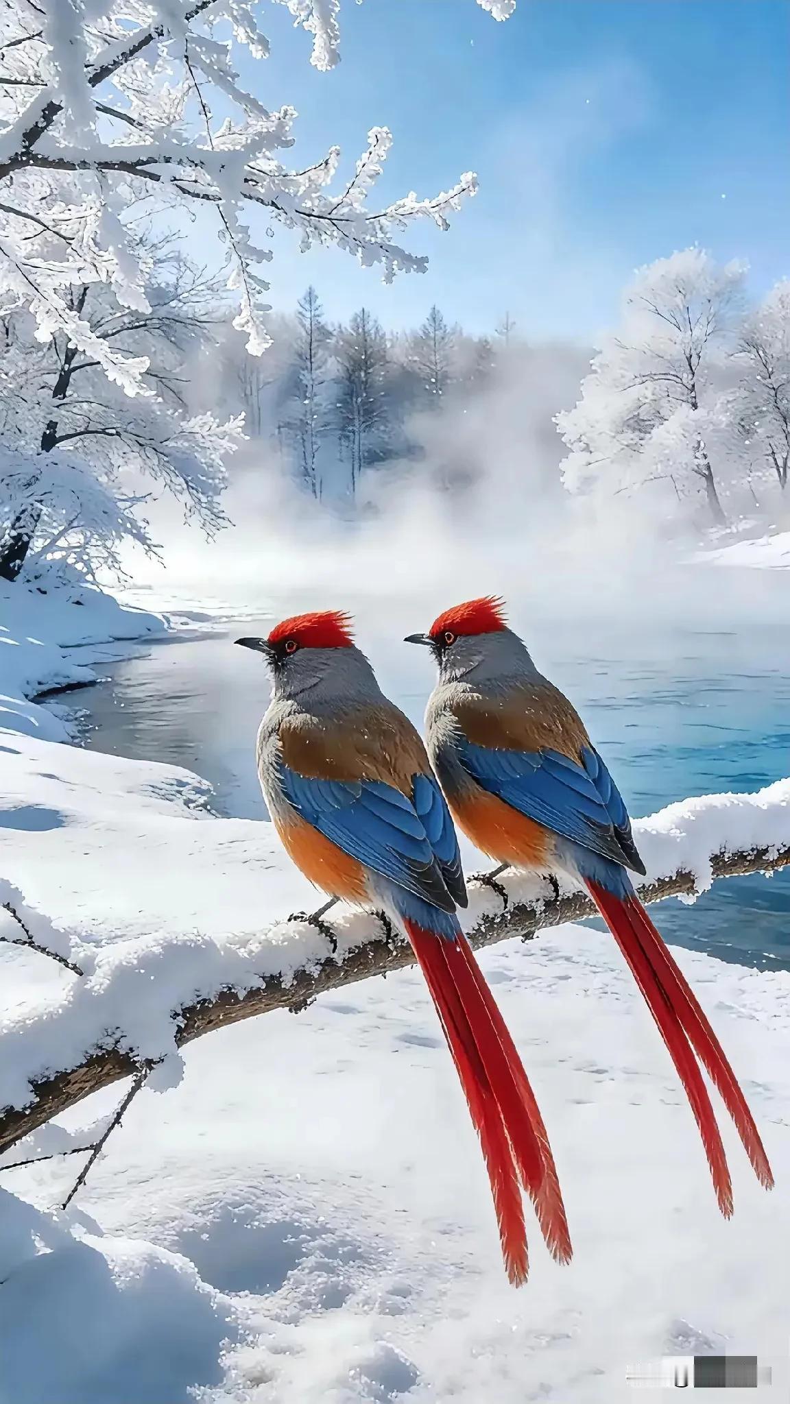 红衣鸟儿立雪堆,寒冬静看水潺潺。