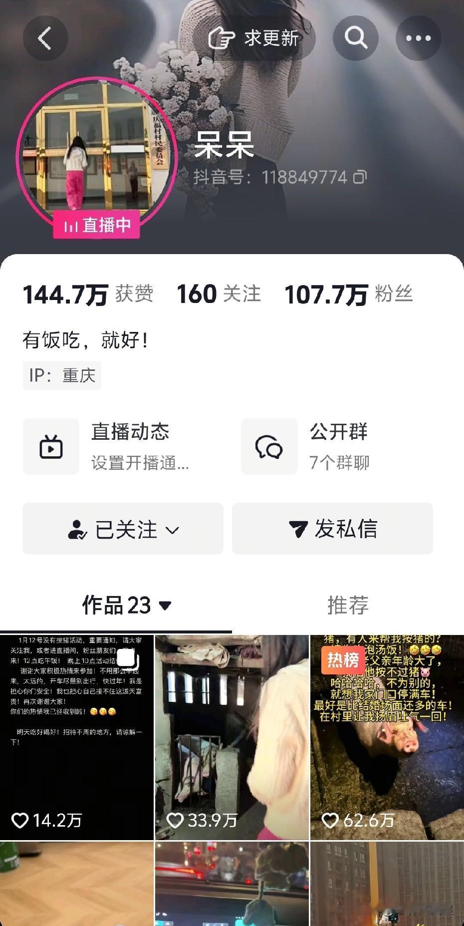这次重庆合川@呆呆发起的万人去她家喝刨猪汤活动,最亏的应该是这位“送猪哥”了,这位送猪哥抖音账号东哥,当他得知呆呆家的两头猪可能不能满足远道而来的热心网友吃刨猪汤时,花了2100元从亲戚家买了一头近300斤的大白猪,租了一辆货拉拉送到了呆呆家,合川文旅发的网友按的白猪就是他送过去的。别的网友都是去吃刨猪汤,他却贡献了一头近300斤的大猪,是不是太亏了? 而与呆呆相比,呆呆家只是杀了两头猪,呆呆却收获了100多万粉丝,两天的几场直播,直播间火箭,跑车,嘉年华等礼物满天飞,各大媒体采访报道。 大家说,这次刨猪汤活动中最亏的是不是这位送猪东哥?重庆网红呆呆 合川刨猪汤 送猪哥
