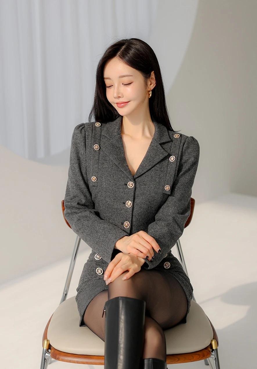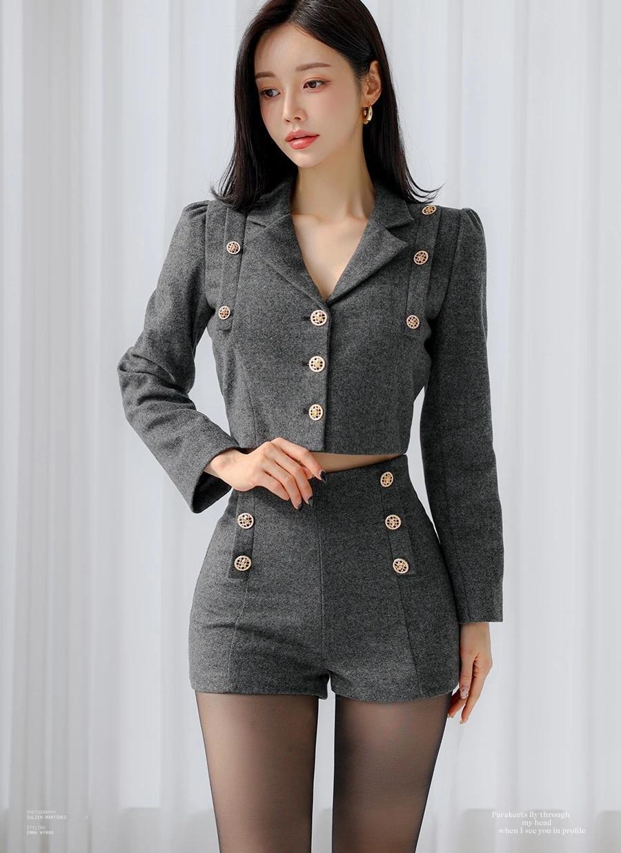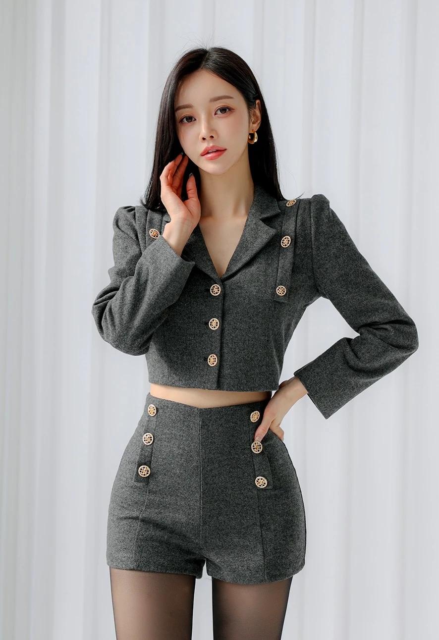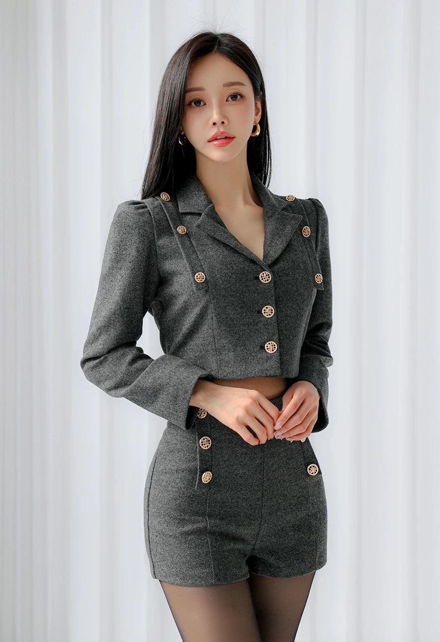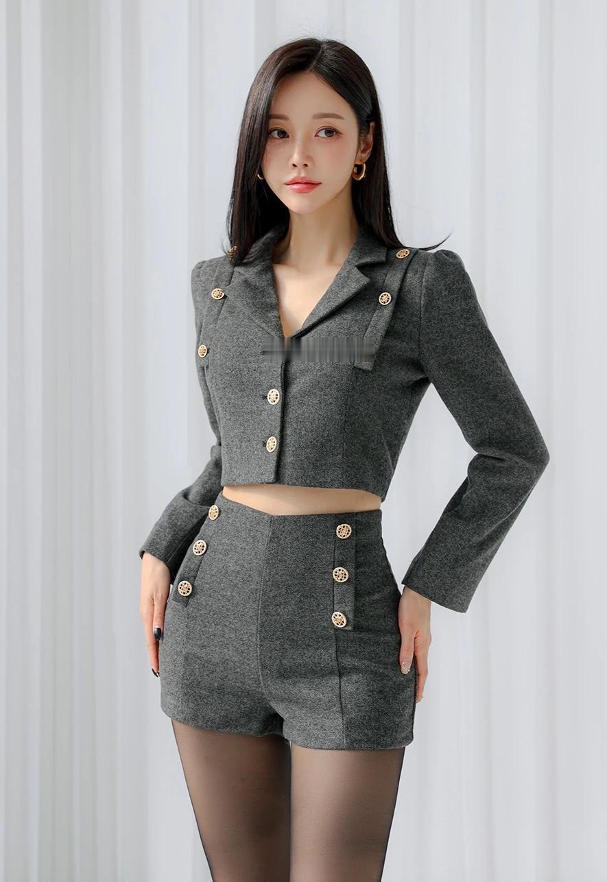 孙允珠这灰色双排扣短外套配高腰短裤的穿搭,简直绝了!灰色双排扣短外套自带高级感,