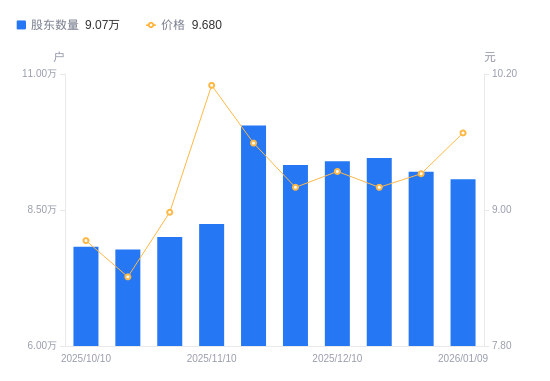 日期A股户数(户)流通A股户均持股数(股)户均持股市值(万元)2026-01-099067125812.5924.992025-12-319202225433.6223.702025-12-199454524754.9122.772025-12-109397724904.5323.262025-11-289326925093.5823.092025-11-2010052823281.6022.332025-11-108241328399.0728.682025-10-318002929245.0626.262025-10-207775530100.3525.312025-10-107826429904.5926.11