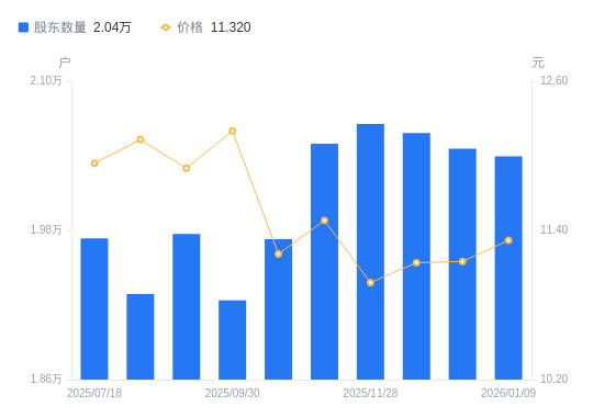 近一年(2025年1月20日至2026年1月9日),招商积余A股股东户数从2.07万户,减低至2.04万户,降幅1.66%,区间股价上涨20.68%。