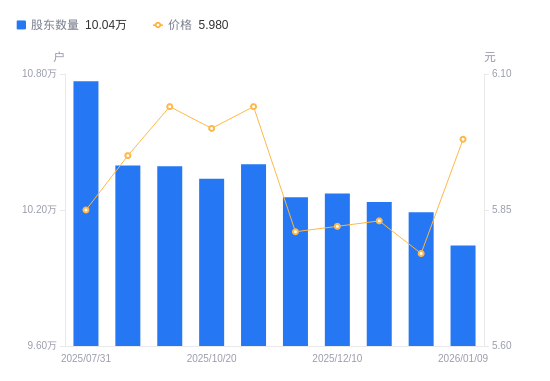 日期A股户数(户)流通A股户均持股数(股)户均持股市值(万元)2026-01-0910043918482.3411.052025-12-3110190218216.9910.512025-12-1910235718136.0110.572025-12-1010272318071.4010.522025-11-2810256018100.1210.522025-11-1010401817846.4110.782025-10-2010337417957.5910.772025-10-1010392817861.8710.792025-09-3010396217856.0310.622025-07-3110767917239.6510.09