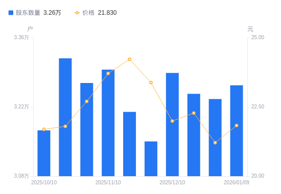 日期A股户数(户)流通A股户均持股数(股)户均持股市值(万元)2026-01-09326385860.5412.792025-12-31323595911.0712.542025-12-19324655891.7713.132025-12-10328885815.9912.792025-11-28315026071.8814.202025-11-20321005958.7614.432025-11-10329555804.1713.762025-10-31326855852.1113.282025-10-20331845764.1112.572025-10-10317266029.0113.08