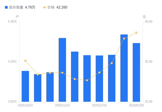 日期A股户数(户)流通A股户均持股数(股)户均持股市值(万元)2026-01-09475988899.8537.612025-12-31501918440.0634.442025-12-19440749611.4533.312025-12-10438759655.0531.202025-11-28439649635.5029.252025-11-20450419405.1028.842025-11-10491348621.6327.812025-10-313884010906.6835.132025-10-203827011069.1235.202025-10-103923910795.7738.06