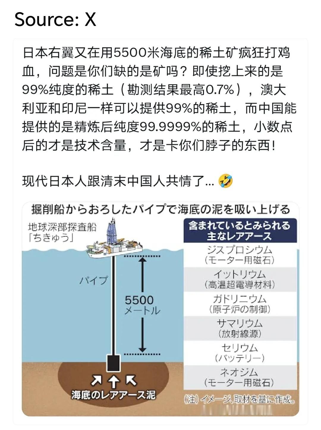 日本去深海挖稀土了,我们该怎么办?[笑哭]挖呗,非但不要给它添乱,还要估计他们去挖。 别人愿意自力更生独立自主有什么不好。 他们在闹钓鱼岛事件的时候就被我们卡过一次脖子了。 那个时候稀土杀手锏一拿出来,他们就跪了。 说要自力更生独立自主,到现在14年了吧,怎么还没有独立自主,怎么还是在稀土上被卡脖子啊? 独立自主自力更生这一招不是每个人都能玩的。 希望日本企业能撑到日本人自己搞出合格的稀土永磁产品的那一天。 貌似日系汽车在中国市场份额雪崩,日本还能坚持多久。 一年之后,日本还能停留在全球第四的位置吗? 估计很难。 点右上角关注我,我们一起去看这个魔幻的世界