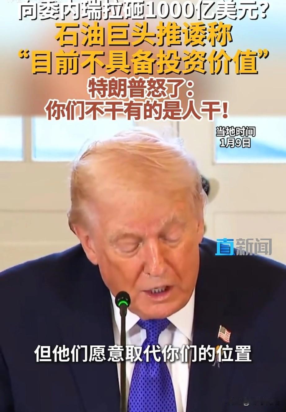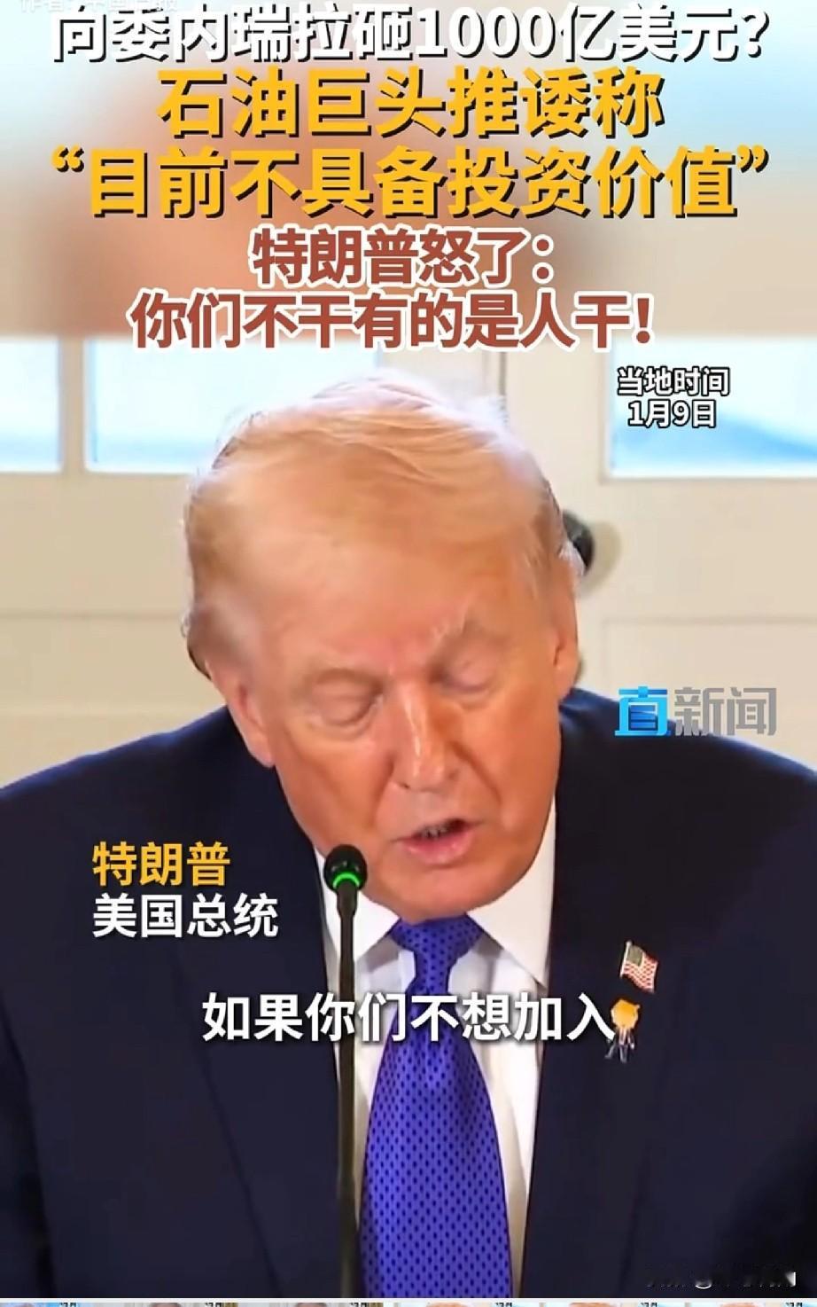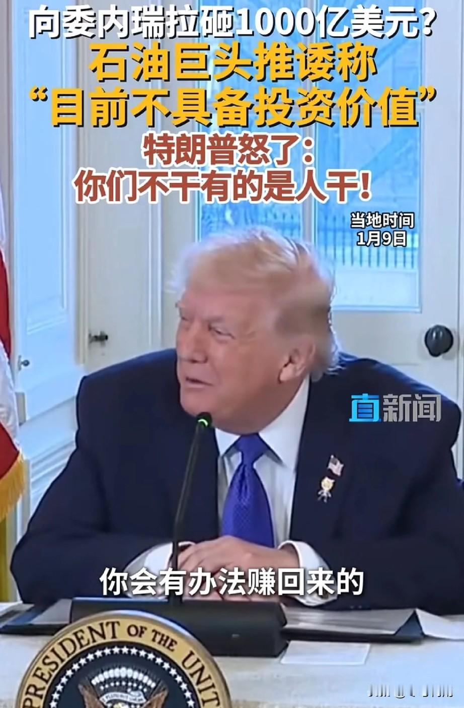 然而却遭遇挫折碰了一鼻子灰,特朗普在白宫发起脾气来,称1000亿美元的委内瑞拉项目,要是你们不做那就更换人员! 会上,特朗普要求那些石油公司往委内瑞拉投入1000亿美元进行投资,谁知道公司高管们集体不认可,直接表明“当下不具备投资的价值”,所表达的意思是:风险过大,不想去做冤大头。 特朗普当场就发怒了,抛出那句经典且厉害的话语:“你们不做,会有其他人去做!”。 画面感强烈至极——往昔商界的大腕特朗普,面对自家石油巨头,竟然也存在被“打脸”的情形。 委内瑞拉这潭复杂棘手的浑水,就连美国石油巨头都不敢轻易涉足,而特朗普却是凭借政治意志强硬地去撼动市场规律。 看起来呀,MAGA的“美国优先”口号,也难以抗衡资本对于风险的天然警觉之情。 这价值1000亿美元的大饼,最终究竟谁会来接手呢? 特朗普心里根本没有确切答案,只能放出狠话来给自己找找面子。