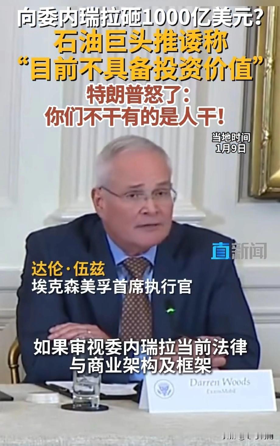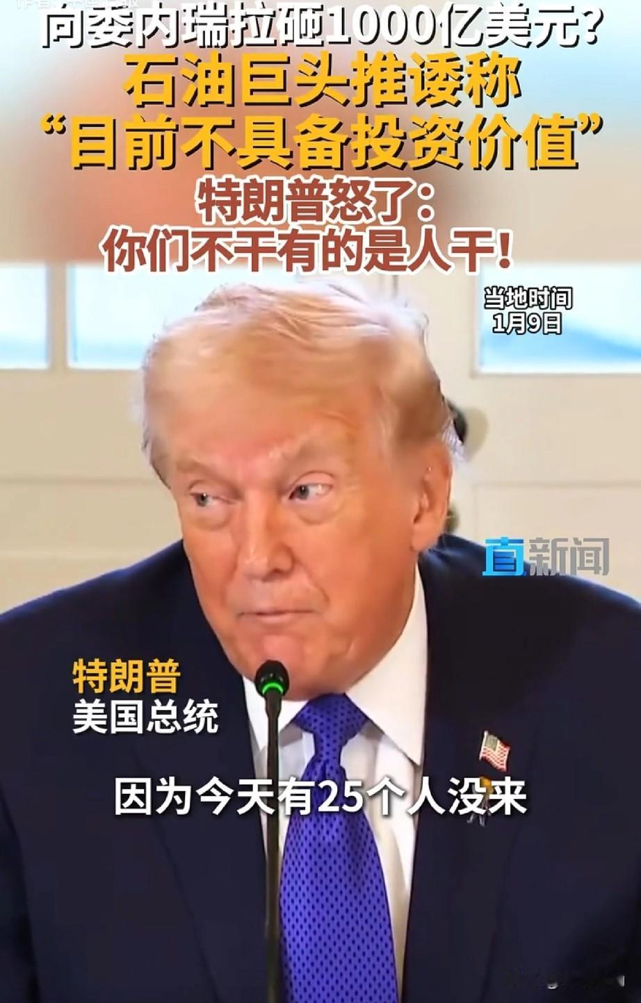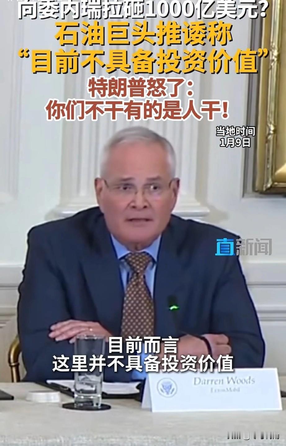 然而却遭遇挫折碰了一鼻子灰,特朗普在白宫发起脾气来,称1000亿美元的委内瑞拉项目,要是你们不做那就更换人员! 会上,特朗普要求那些石油公司往委内瑞拉投入1000亿美元进行投资,谁知道公司高管们集体不认可,直接表明“当下不具备投资的价值”,所表达的意思是:风险过大,不想去做冤大头。 特朗普当场就发怒了,抛出那句经典且厉害的话语:“你们不做,会有其他人去做!”。 画面感强烈至极——往昔商界的大腕特朗普,面对自家石油巨头,竟然也存在被“打脸”的情形。 委内瑞拉这潭复杂棘手的浑水,就连美国石油巨头都不敢轻易涉足,而特朗普却是凭借政治意志强硬地去撼动市场规律。 看起来呀,MAGA的“美国优先”口号,也难以抗衡资本对于风险的天然警觉之情。 这价值1000亿美元的大饼,最终究竟谁会来接手呢? 特朗普心里根本没有确切答案,只能放出狠话来给自己找找面子。