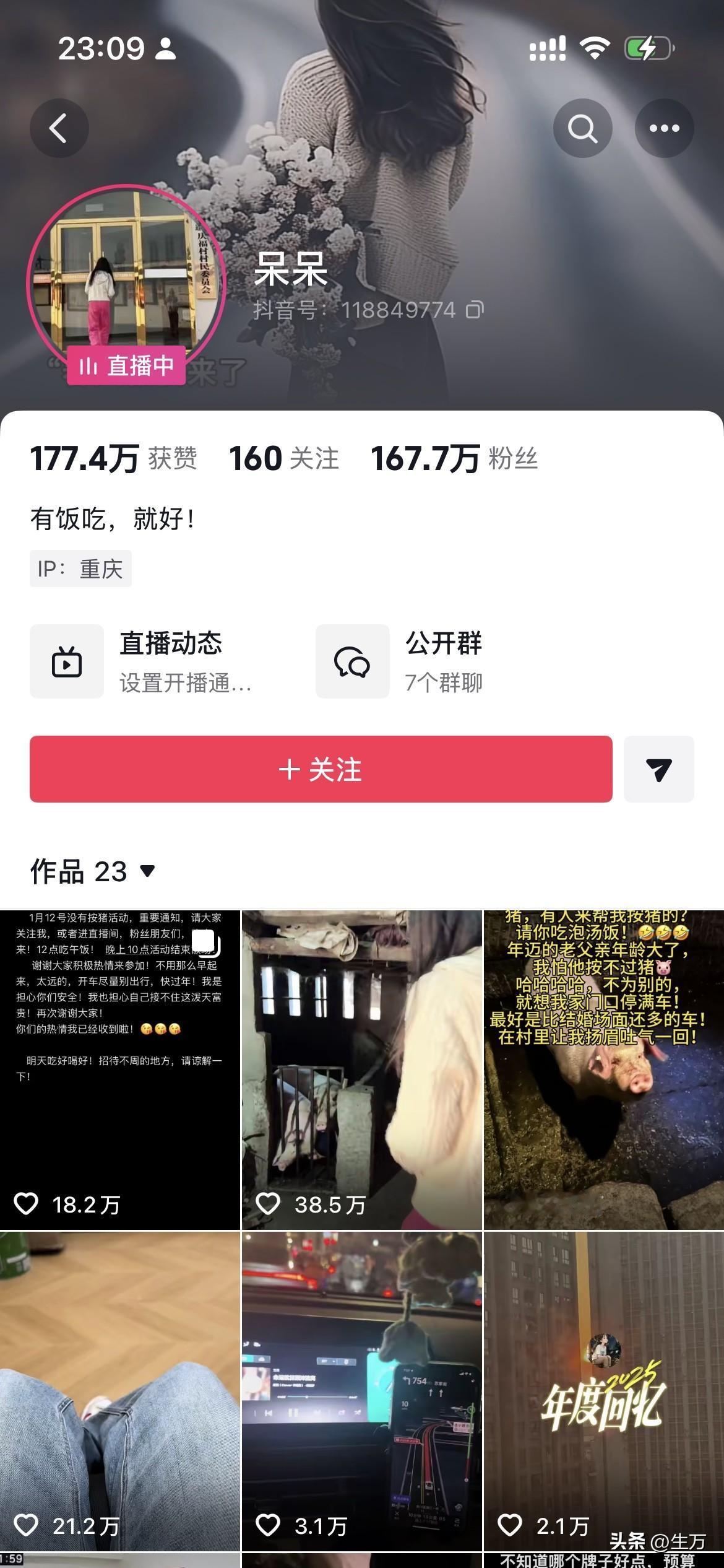 已经深夜了,重庆合川呆呆的粉丝量已经来到了167万[捂脸] 而且,她今天一直开着直播,即便已经深更半夜了,但是直播间还有几十万人[看] 所以现在还有人,在披星戴月地开着车,赶往他的老家合川 ,想去继续吃泡汤肉,所以在今天晚上他又发了一个简短的说明,意思就是明天还要继续[捂脸] 而与此对应的是合川相应的文化旅游,以及各个职能部门反应的也比较快,他们在保证供电通信的同时,做好了交通的疏导,人员的接待,尽可能的让不远万里跑到这里来吃刨汤朋友们不失望! 而且感觉大家现在拧成一股绳,现在包括卤鹅哥这种前段时间比较火的网红,都主动地跑来帮忙,大家想通过自己的努力,稳稳的把这一波流量接住。 当然也有人说看不懂为什么这个呆呆突然就火了,也有人说,这种流量本来来得快去得也快,但不管怎么样,网络世界就是这样,当一个事情受到关注的时候,还真的是考验当地各个部门的反应能力,如果他们表现得比较好,那么这个事情就真的会为当地的老百姓以及文化旅游带来比较良性的输入。 其实从这个层面上来说,不管这个事情能够火多久,能够让参与的人觉得有情绪价值,同时大家都得到实实在在的好处,这本身就是比较正能量的事情。