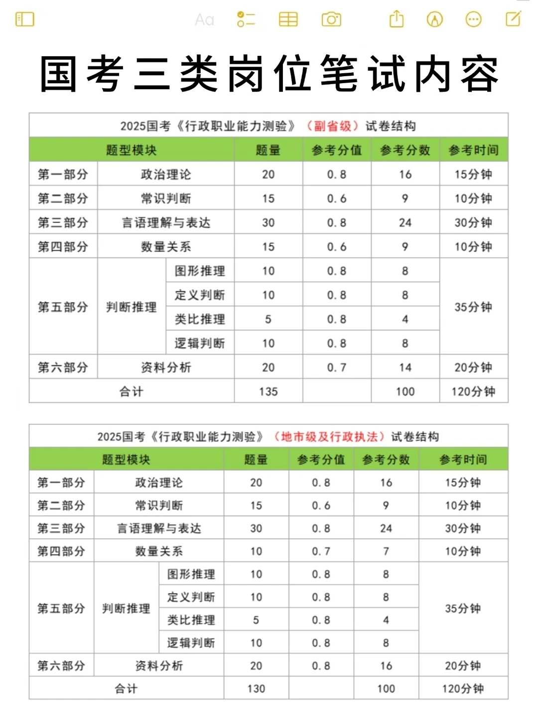 ◼ 题量:国考副省级行测135题、地市级和执法类行测130题(数量关系模块上的差别),文职公共科目(基础知识60题、岗位能力50题)共110题