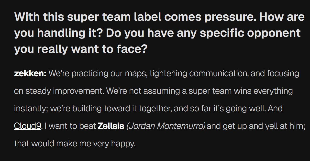 zekken:"我们正在练习地图,加强沟通,专注于稳步的提升中。我们并不认为所谓的"银河战舰"是能立刻赢下所有比赛的。我们正在共同努力朝着这个目标前进,而目前为止一切顺利。至于C9,我特别想打败Zellsis,然后站起来冲他大喊,那我会很开心。"
