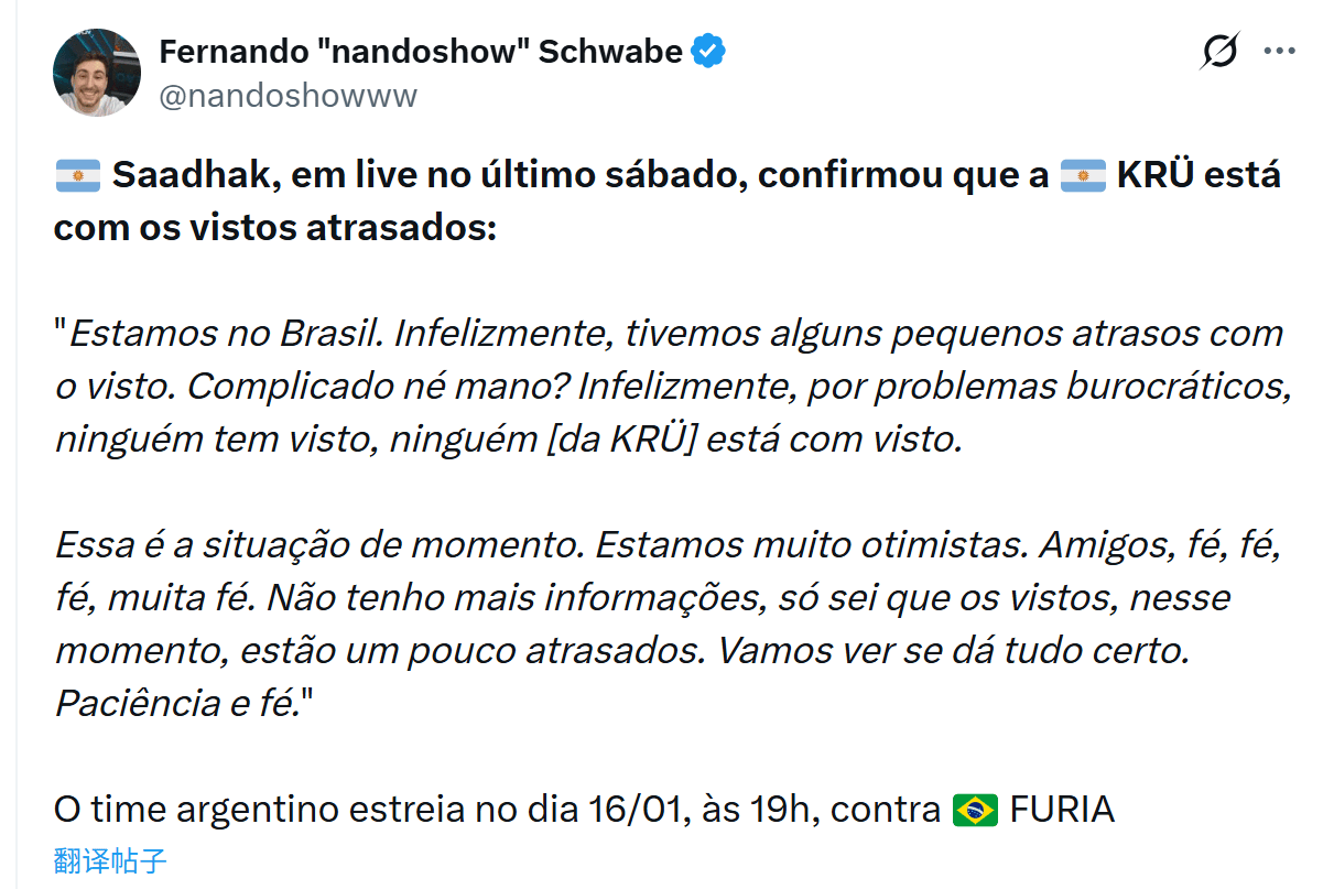 虎扑01月13日讯近期美洲赛区在举行启点赛前媒体日,但之后宣布KRÜ的媒体日择日举行。KRÜ选手Saadhak则在上周六表示队伍存在签证问题: