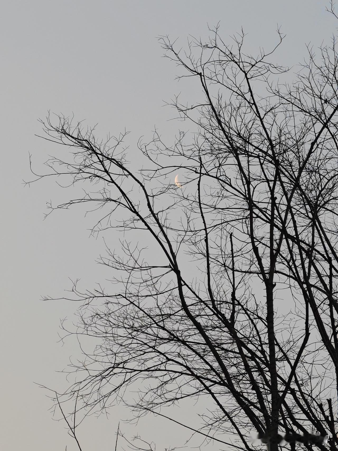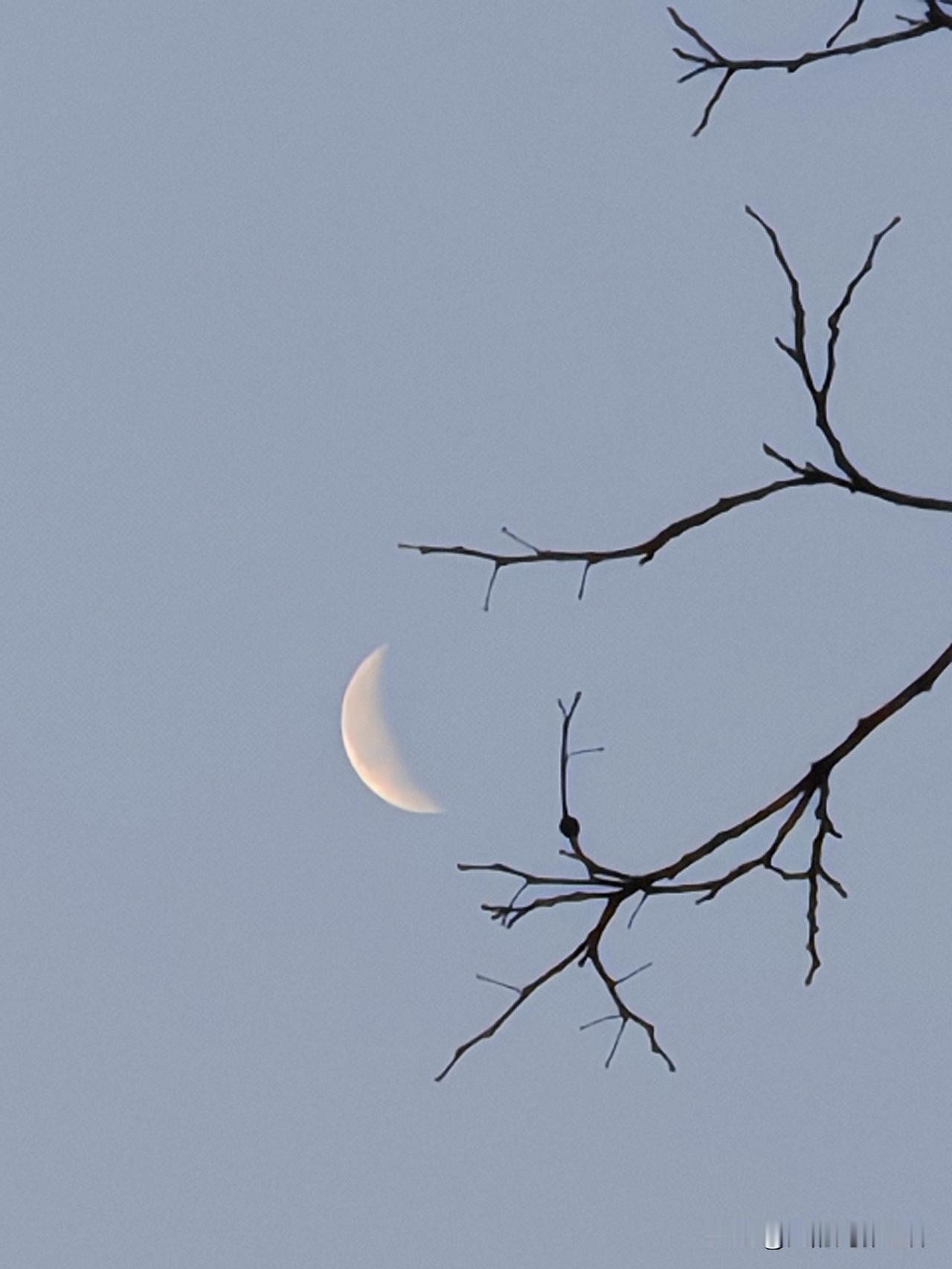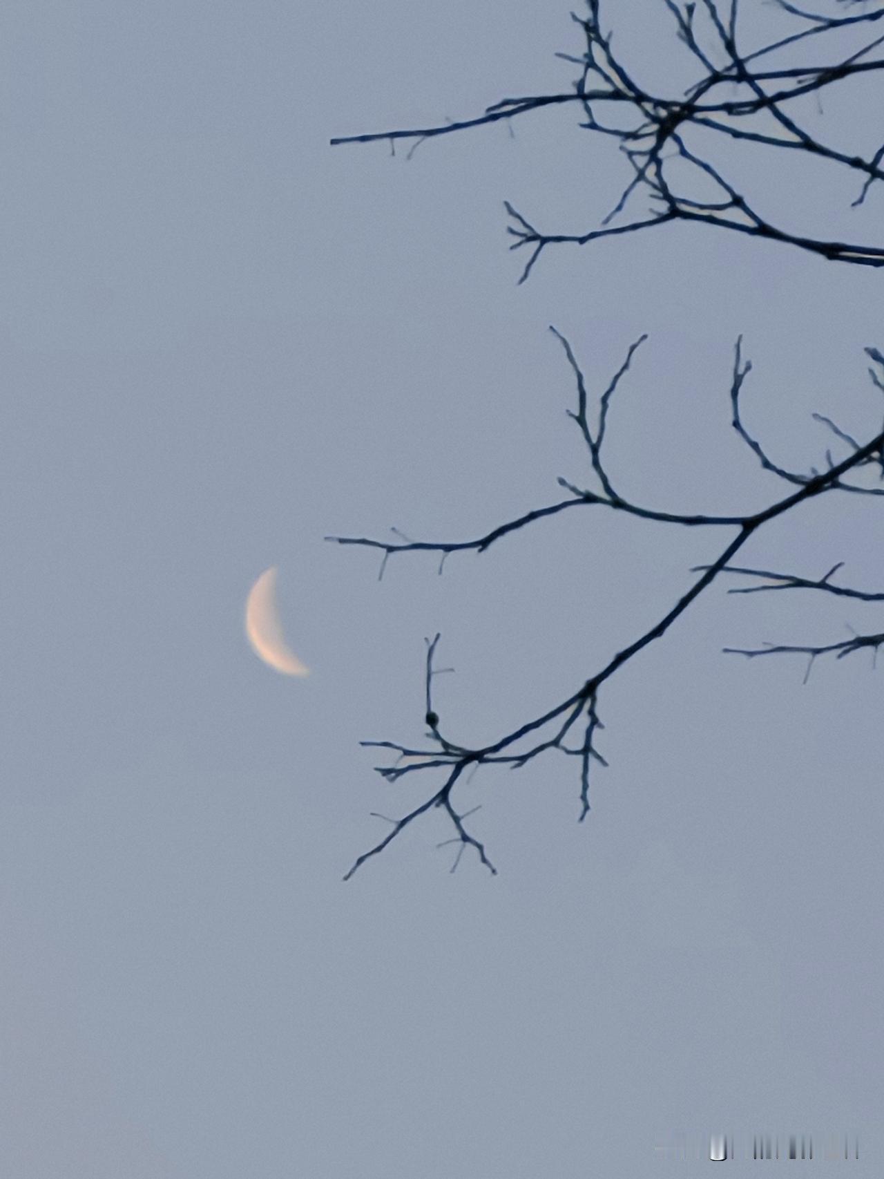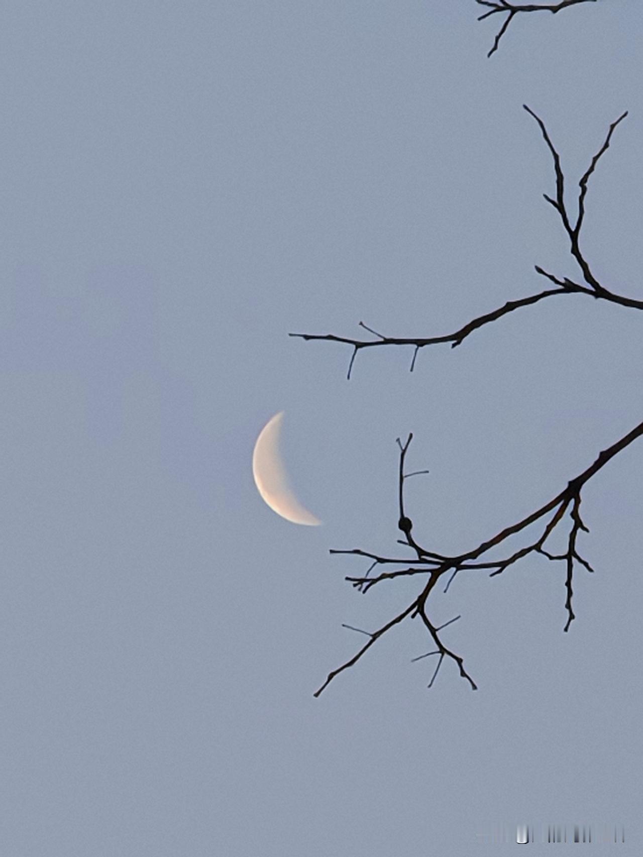 它褪去了夜的清辉,薄得像一片被风揉皱的霜,像一位中国仕女画上美女的一弯眉。树枝还凝着未消的雾气,与它遥遥相照,天地间便漫开一层淡淡的凉。 早起的雀鸟掠过,翅膀碰落了一片枯叶,惊得弯月轻轻晃了晃。它不慌不忙,要等冬阳漫过南山,才化作一缕白,悄然藏进云里。