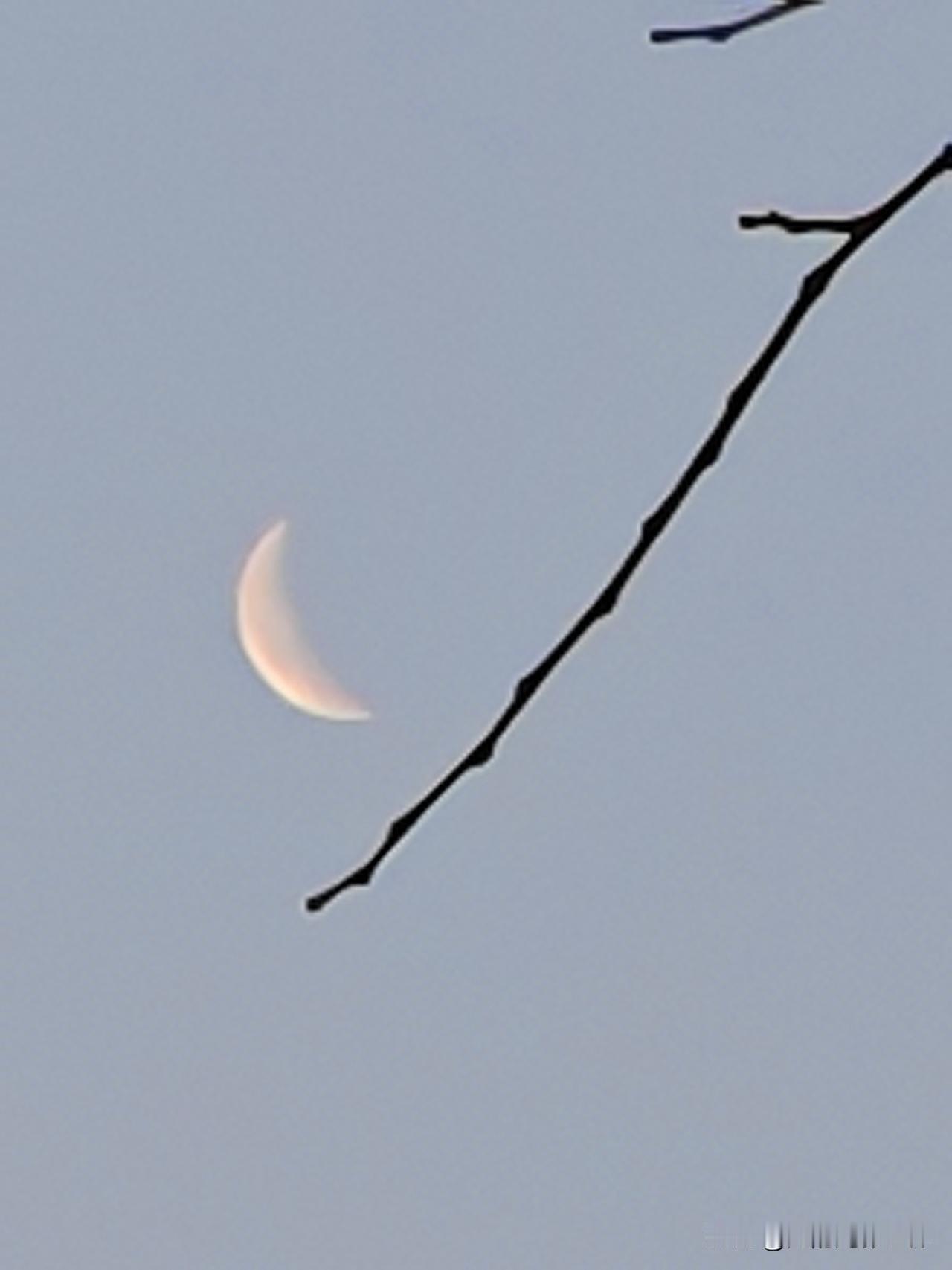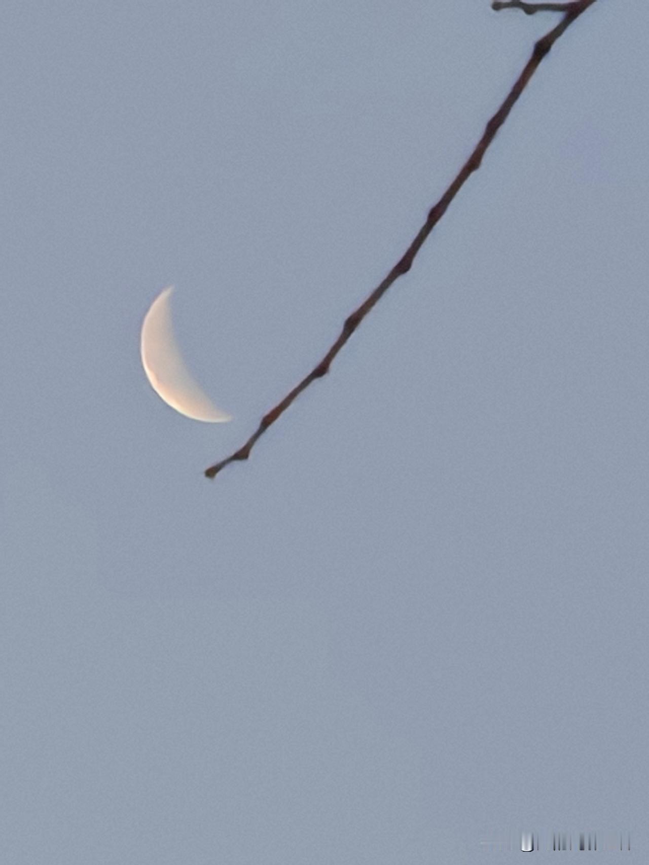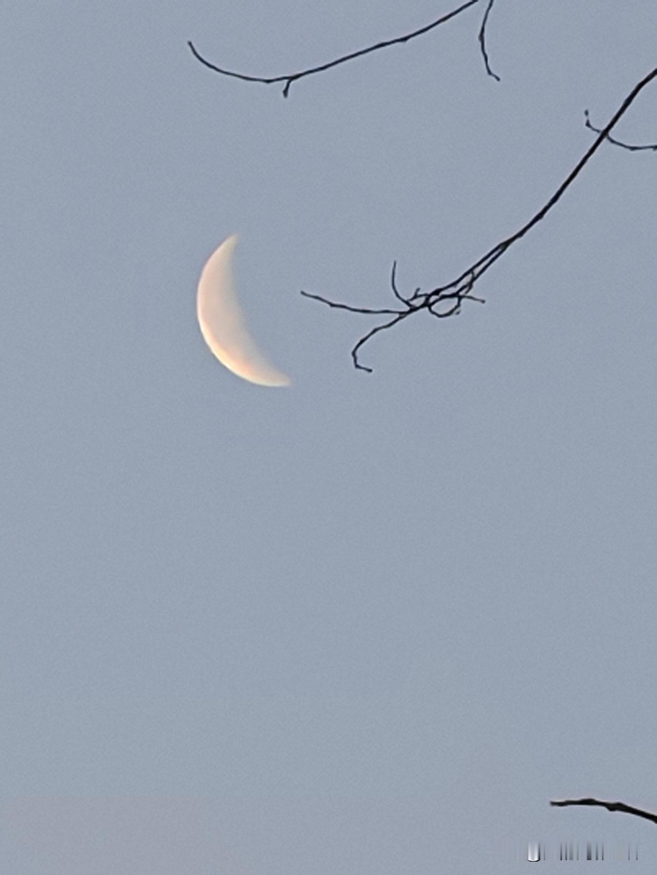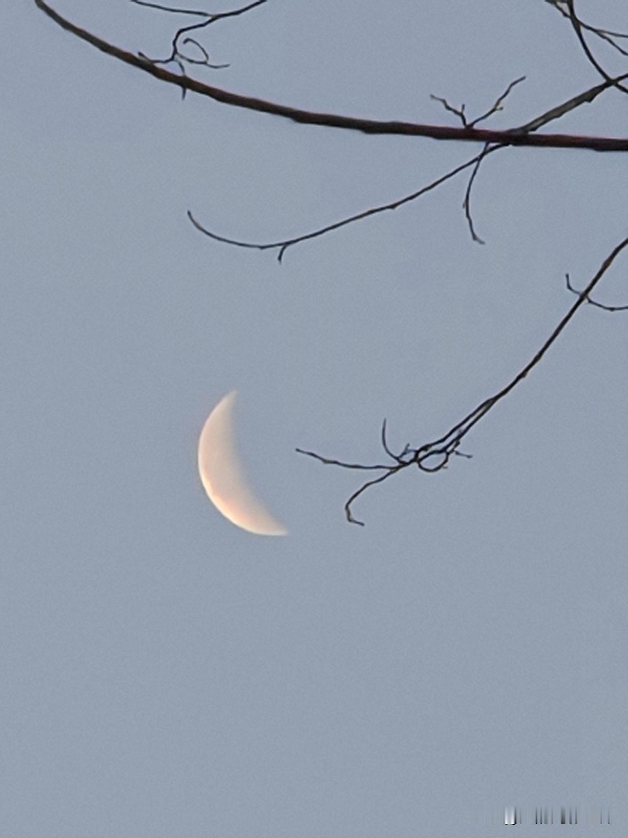 它褪去了夜的清辉,薄得像一片被风揉皱的霜,像一位中国仕女画上美女的一弯眉。树枝还凝着未消的雾气,与它遥遥相照,天地间便漫开一层淡淡的凉。 早起的雀鸟掠过,翅膀碰落了一片枯叶,惊得弯月轻轻晃了晃。它不慌不忙,要等冬阳漫过南山,才化作一缕白,悄然藏进云里。