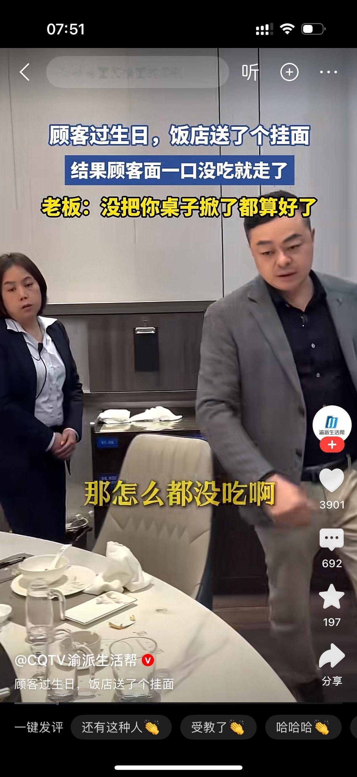 顾客过生日,饭店送了一个挂面。结果顾客面一口都没吃就走了。老板发现后,找来店长问