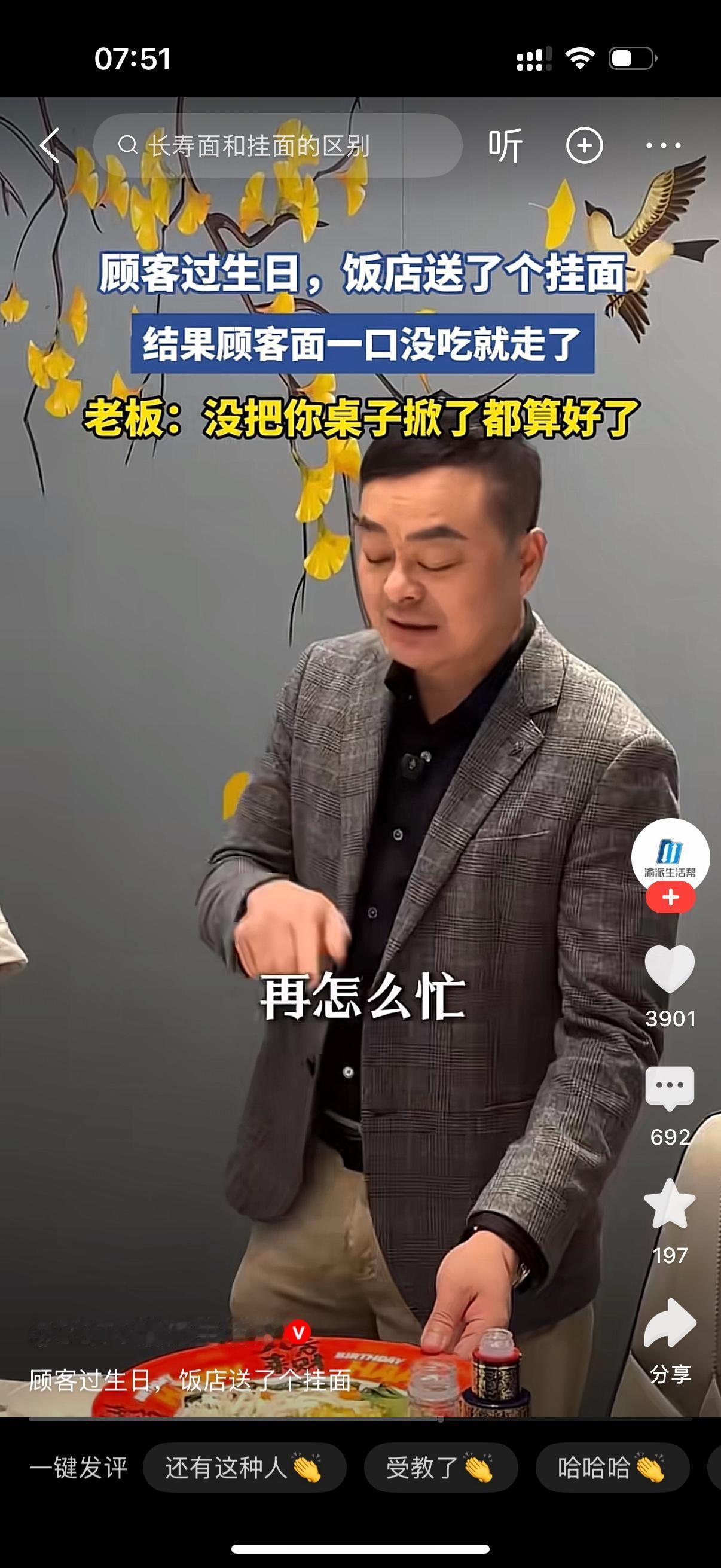 顾客过生日,饭店送了一个挂面。结果顾客面一口都没吃就走了。老板发现后,找来店长问什么情况?店长解释说当时太忙,面线没有了,就用挂面替代了。老板怒斥他,生日的长寿面怎么能用挂面替代了?客人没掀你桌子算客气了。真奇怪,长寿面怎么就不能用挂面了?