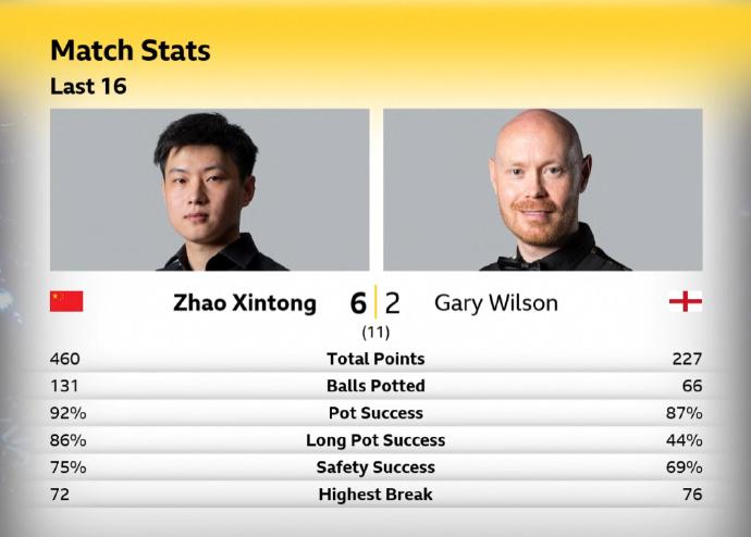 斯诺克:创造记录!2026大师赛中国已3人晋级八强! 北京时间1月12日至次日凌晨,2026大师赛结束第二个比赛日的争夺。 凌晨的首轮比赛,赵心童在先丢一局后连拿4局,最终同样以6-2的比分获胜,晋级8强!已经登场的三位中国选手吴宜泽、肖国栋、赵心童全部获胜,刷新了此前八强两位中国选手的历史最好纪录!接下来丁俊晖对阵世界第一特鲁姆普、斯佳辉挑战世界第二威尔逊,两场硬仗能否继续带来惊喜?理论上有可能5名中国球员全部晋级八强。 另外一场早场时段的比赛,威廉姆斯在2-1后一泻千里,终场进攻成功率仅71%。艾伦连拿5局,以6-2获胜,晋级八强! 今日赛程,21:00,率先出战的斯佳辉挑战世界第二威尔逊,争取再创纪录! 凌晨时段,希金斯对阵霍金斯。 明天同样的黄金时间,最后一名中国球员丁俊晖将会披挂上阵,能否掀翻世界第一? 赛果: 1月12日(周一),【16进8轮次,11局6胜】 21:00 马克·威廉姆斯 2-6 马克·艾伦 次日3:00 赵心童 6-2 加里·威尔逊 赛程: 1月13日(周二),【16进8轮次,11局6胜】 21:00 凯伦·威尔逊 vs 斯佳辉 次日3:00 约翰·希金斯 vs 巴里·霍金斯 1月14日(周三),【16进8轮次,11局6胜】 21:00 贾德·特鲁姆普 vs 丁俊晖 次日3:00 尼尔·罗伯逊 vs 克里斯·韦克林