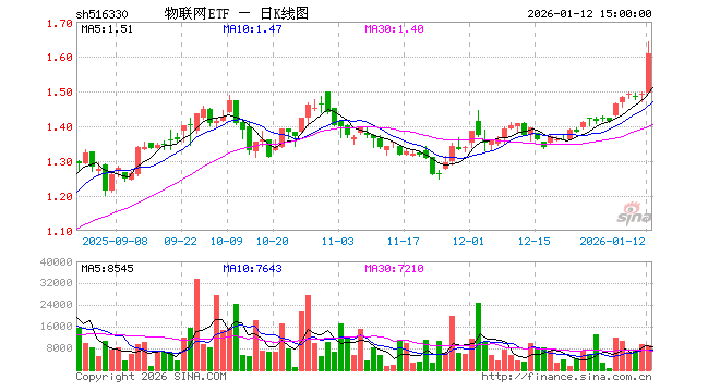 1月12日,物联网ETF(516330)涨7.77%,成交额141.26万元。当日份额增加480.00万份,最新份额为1327.13万份,近20个交易日份额增加360.00万份。最新资产净值计算值为2046.43万元。