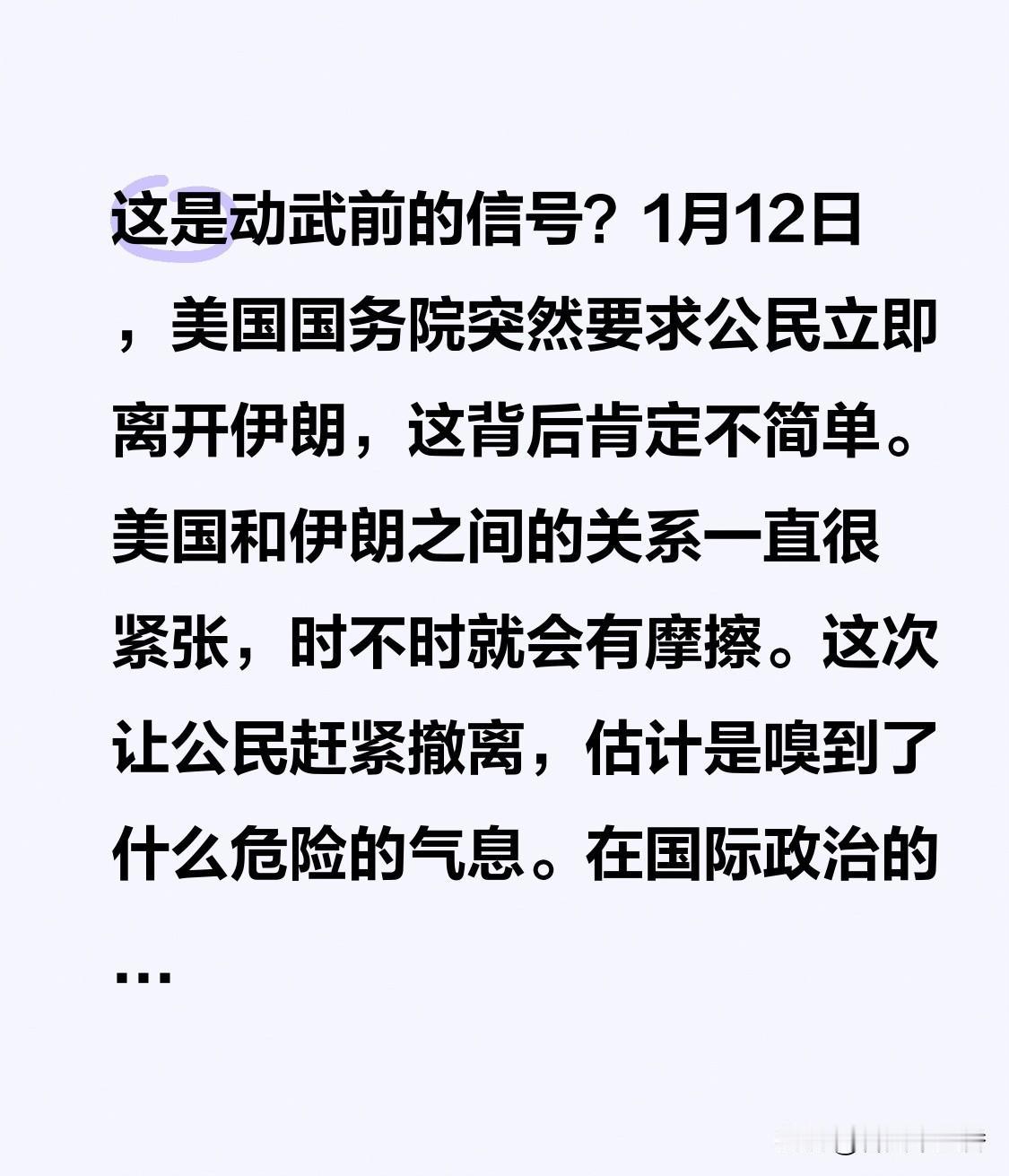这难道是动武前吹响的“集结号”?1月12日,美国国务院突然让公民麻溜离开伊朗,背后肯定藏着猫腻。美伊关系就像随时会爆炸的火药桶,摩擦不断。这次让公民撤离,估计是美国闻到了危险“味儿”。 在国际政治这场大棋局里,美伊每一步都像揪着世界的“小辫子”。美国公民在伊朗的处境会随两国关系变得像迷宫一样复杂。说不定美伊又要闹出新冲突,给地区局势添乱,后续走向就像开盲盒,谁也不知道啥样。