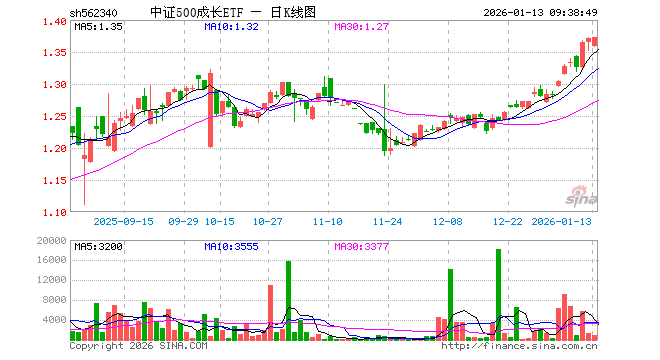 1月13日,中证500成长ETF(562340)开盘跌0.95%,报1.358元。中证500成长ETF(562340)重仓股方面,华工科技开盘涨0.77%,恺英网络涨0.53%,东吴证券涨0.00%,恒玄科技跌3.01%,科达利跌0.10%,水晶光电跌0.08%,天山铝业跌0.22%,春风动力跌0.03%,杰瑞股份跌1.09%,顺络电子跌0.71%。