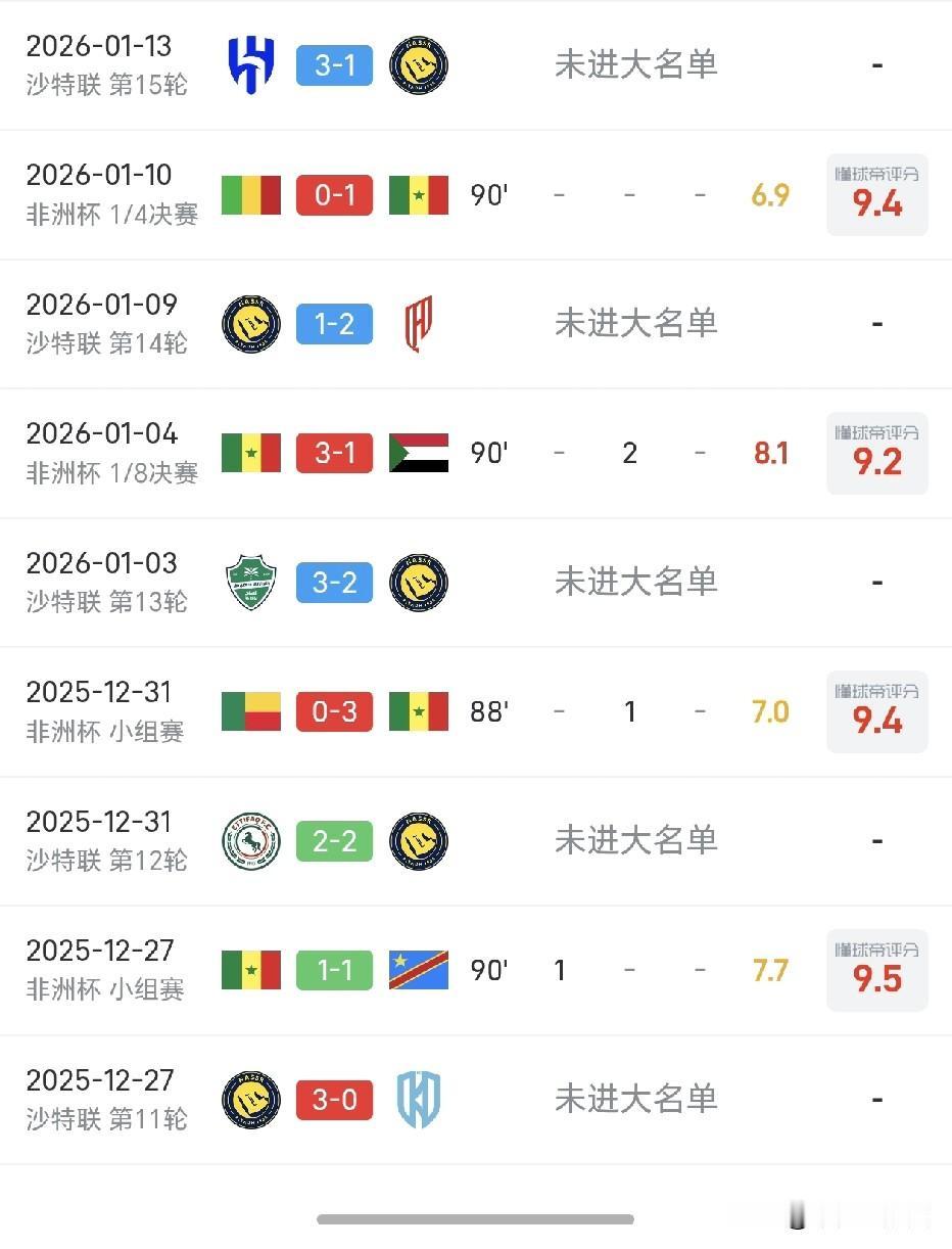 马内回归利雅得后,可能都傻眼了,走的时候明明领先4分,来的时候被反超7分了,这合理吗。 因为要回国参加非洲杯,所以马内从第11轮比赛时,就没有参加,直到现在,非洲杯已经打进四强,最多还有两场比赛,也就是还要缺席两场或者三场的联赛比赛。 马内走时,利雅得胜利领先利雅得新月4分,当时可是保持10连胜啊。现在,一平三负,落后7分。 等马内回来,看到此景,又注定是四大皆空,懵逼了。 马内 利雅得胜利