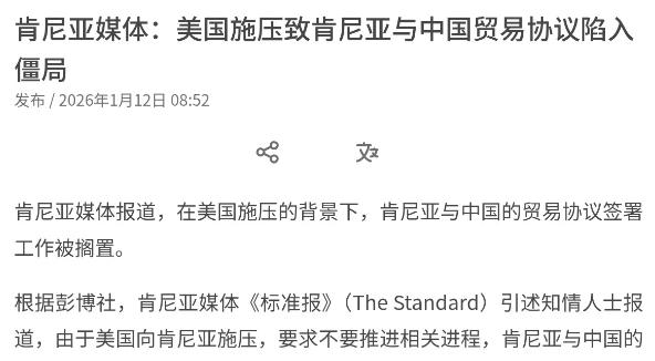 对我们而言,这可不是一个好消息!当地时间1月12日,根据外媒报道,外媒称,由于美国向肯尼亚施压,要求不要推进与中国相关合作的进程,肯尼亚与中国的贸易协议签署受阻。 外媒表示,现在肯尼亚面临的是一个二选一的局面。一方面,肯尼亚正寻求延长其参与美国《非洲增长与机遇法案》的期限,该法案对部分输美商品实行关税减免。 这事儿往深了想,美国这波操作压根不是简单的贸易竞争,纯属是把经贸合作当成了地缘博弈的筹码,逼着肯尼亚在大国之间选边站队,而这背后藏着的套路,对我们来说确实不是什么好信号。 要知道肯尼亚之所以陷入这种二选一的两难境地,核心就是美国攥着《非洲增长与机遇法案》这个“小辫子”不放。 这个法案对肯尼亚来说可不是可有可无的东西,之前靠着它,肯尼亚的纺织品等商品能免税进入美国市场。 每年光是对美服装出口就价值超过6亿美元,还直接撑起了6.6万个就业岗位,这里面大部分还是女性岗位,说它是肯尼亚外贸的“生命线”一点都不过分。 现在这个法案已经到期了,肯尼亚急着延长期限,美国就正好抓住这个软肋,明里暗里放话,要是敢跟中国签贸易协议,不仅延长法案没门,就连想加入美国主导的“战略贸易与投资伙伴关系协定”都得泡汤。 更狠的是,美国国会还动起了重新评估肯尼亚“主要非北约盟友”地位的心思,把经济优惠和安全地位绑在一起施压,说白了就是逼肯尼亚做单选题。 而肯尼亚和我们的贸易协议,本就是双赢的好事,之前双方都快谈成了,协议里包含了肯尼亚的茶叶、咖啡、鳄梨这些特色农产品。 一旦签署,这些商品输华就能享受零关税,对肯尼亚来说,中国14亿人的大市场哪怕只打开1%,都能彻底改变不少农民的生活,这也是他们之前积极推进合作的核心原因。 可美国就是见不得这种互利共赢的合作,非要跳出来横插一脚,把纯粹的经济合作硬生生贴上“战略忠诚度测试”的标签,这种做法说白了就是霸权主义的老套路,自己搞不定正常的合作竞争,就靠施压胁迫那一套。 更值得注意的是,美国这波操作不是孤例,之前就有风声说他们计划跟70多个国家谈判,限制这些国家和我们的来往,现在拿肯尼亚开刀,多少有点杀鸡儆猴的意思。 要是这招得逞了,后续很可能会有其他发展中国家在和我们合作时被美国用同样的手段施压,这会让我们的对外合作环境变得更复杂。 再看肯尼亚的处境,其实也挺无奈的,一边是美国的关税威胁和地位撤销的压力,搞不好工厂倒闭、工人失业的麻烦就来了,另一边是中国市场带来的实实在在的发展机遇,换谁都得纠结。 但美国这种把发展权利当筹码的做法,本质上是在破坏全球贸易规则,把经济合作搞成了阵营对立,这种操作只会让更多国家看清其霸权本质。 对我们而言,这事儿的警示意义很明显,美国正在把更多经贸议题拖进大国竞争的框架里,试图通过施压盟友、胁迫中小国家的方式,压缩我们的对外合作空间。 虽然肯尼亚总统鲁托之前也表态过和中国合作符合肯尼亚的最佳利益,没完全屈服于美国的压力,但协议签署受阻已经是既定事实。 这也说明我们在推进对外合作时,不得不更加警惕美国这种“经济绑架”的套路,后续可能需要花更多精力帮合作国构建抗风险能力,避免他们被美国的霸权手段裹挟。 说到底,美国这种不靠公平竞争、专靠施压胁迫的做法,短期可能会搅黄一些合作,但长期来看,只会让更多国家反感,毕竟没有哪个国家愿意放弃发展机遇,心甘情愿地当别人的马前卒。