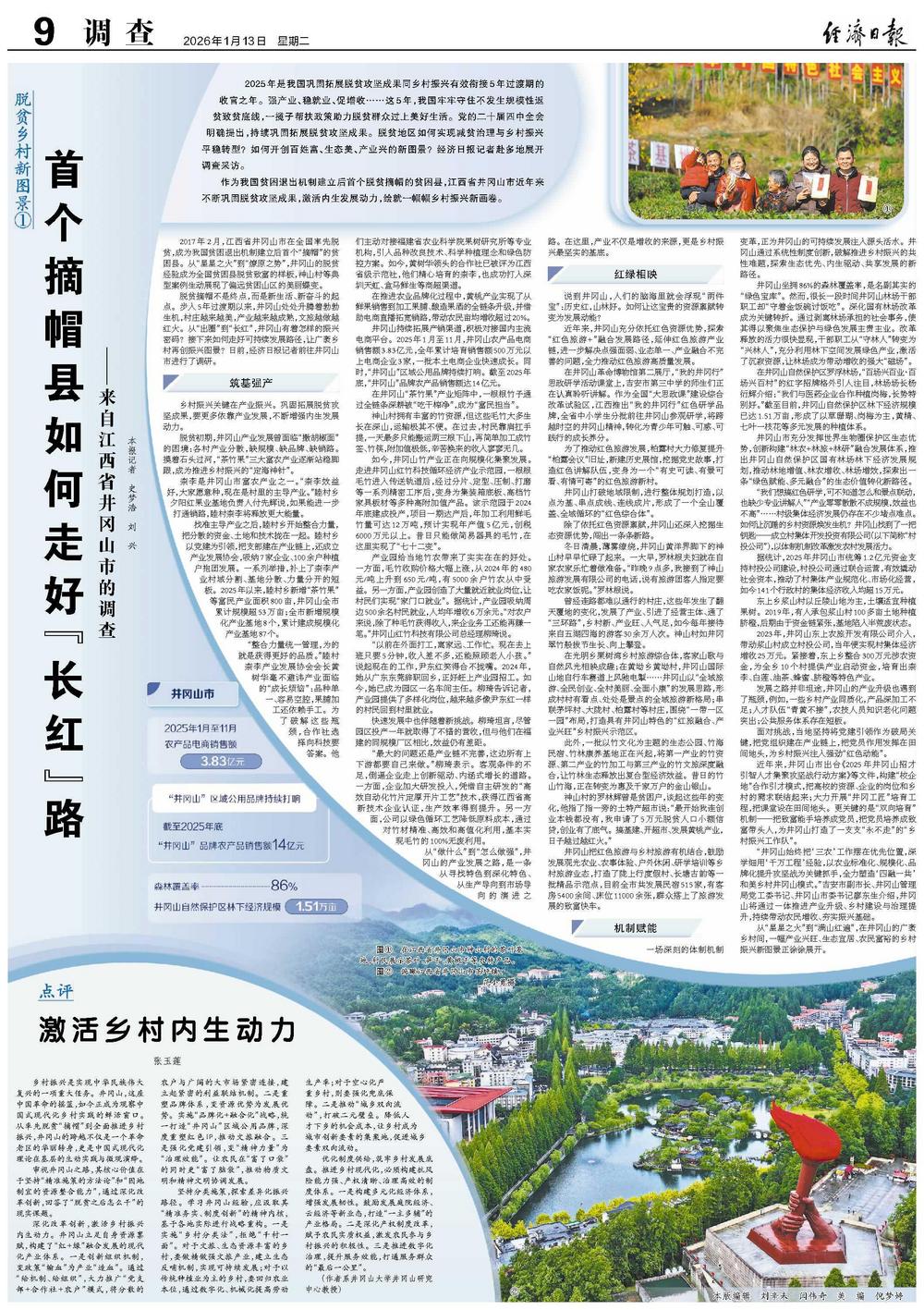 2017年2月,江西省井冈山市在全国率先脱贫,成为我国贫困退出机制建立后首个“摘帽”的贫困县。从“星星之火”到“燎原之势”,井冈山的脱贫经验成为全国贫困县脱贫致富的样板,神山村等典型案例生动展现了偏远贫困山区的美丽蝶变。