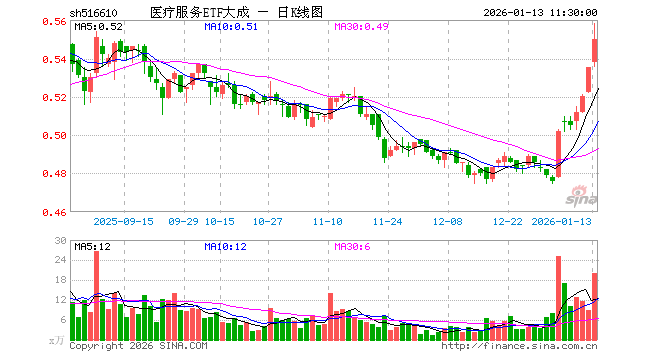 1月13日,截止午间收盘,医疗服务ETF大成(516610)涨2.80%,报0.550元,成交额1102.37万元。医疗服务ETF大成(516610)重仓股方面,迈瑞医疗截止午盘涨0.81%,联影医疗涨3.04%,爱尔眼科涨3.27%,爱美客涨0.89%,惠泰医疗涨1.72%,新产业涨0.17%,鱼跃医疗跌1.45%,乐普医疗涨0.49%,福瑞股份涨0.37%,英科医疗涨0.28%。
