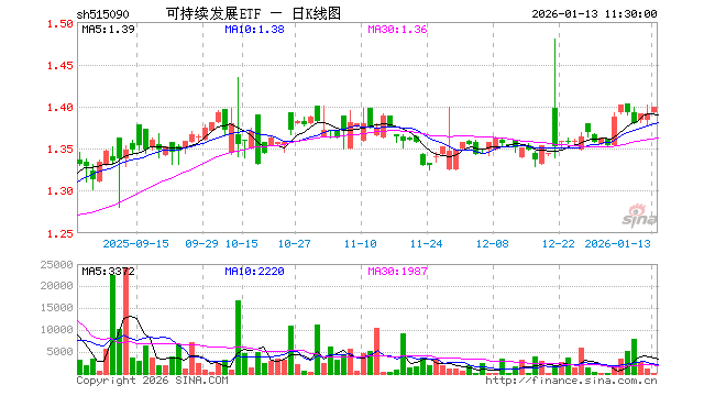 1月13日,截止午间收盘,可持续发展ETF(515090)涨0.58%,报1.399元,成交额9911.00元。可持续发展ETF(515090)重仓股方面,宁德时代截止午盘涨0.24%,贵州茅台跌0.30%,招商银行跌0.05%,美的集团跌2.02%,中际旭创跌0.68%,兴业银行涨0.48%,长江电力涨0.15%,恒瑞医药涨2.19%,比亚迪涨0.86%,药明康德涨5.76%。