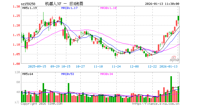 1月13日,截止午间收盘,机器人ETF南方(159258)涨0.00%,报1.224元,成交额7609.62万元。机器人ETF南方(159258)重仓股方面,汇川技术截止午盘跌2.12%,科大讯飞涨4.43%,石头科技跌1.46%,大华股份跌1.60%,中控技术涨15.34%,大族激光跌3.62%,双环传动涨0.00%,科沃斯跌2.10%,机器人跌2.02%,云天励飞跌2.19%。
