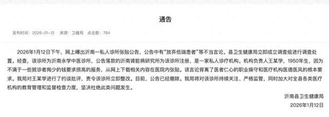 2026年1月12日下午,网上曝出沂南一私人诊所张贴公告,公告中有“放弃低端患者”等不当言论。县卫生健康局立即成立调查组进行调查处置。经查,该诊所为沂南永学中医诊所,公告落款的沂南肾脏病研究所为该诊所注册,是一家私人诊疗机构。机构负责人王某学,1950年生,因为不满于一些就诊者掏少的钱要求很高的服务,从网上下载相关内容在医院内张贴。该言论背离了医者仁心的职业操守和医疗机构医德医风的根本要求。我局对王某学进行了约谈批评,责令该诊所立即整改。目前,公告已经撤除。我局将对该诊所持续关注、严格监管,同时加大对全县各类医疗机构的教育管理和监督检查力度,坚决杜绝此类问题发生。
