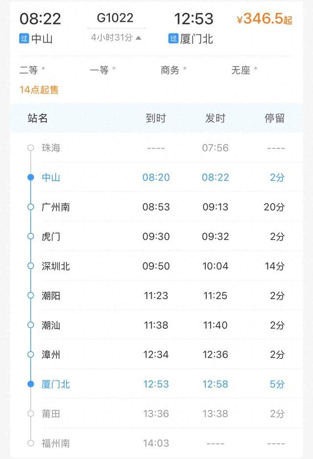 G1022/1次经过的站点:珠海、中山、广州南、虎门、深圳北、潮阳、潮汕、漳州、厦门北、莆田、福州南。